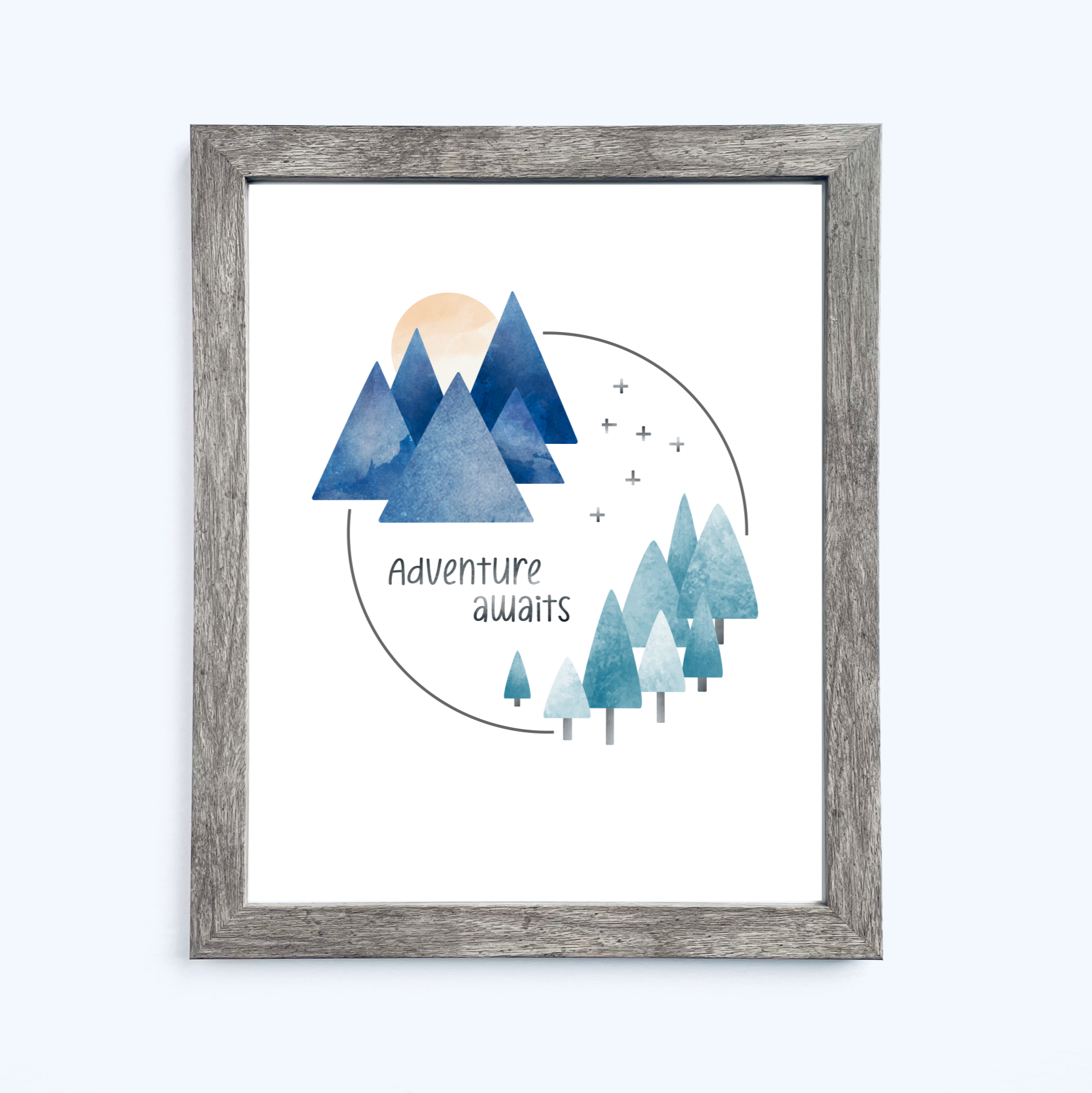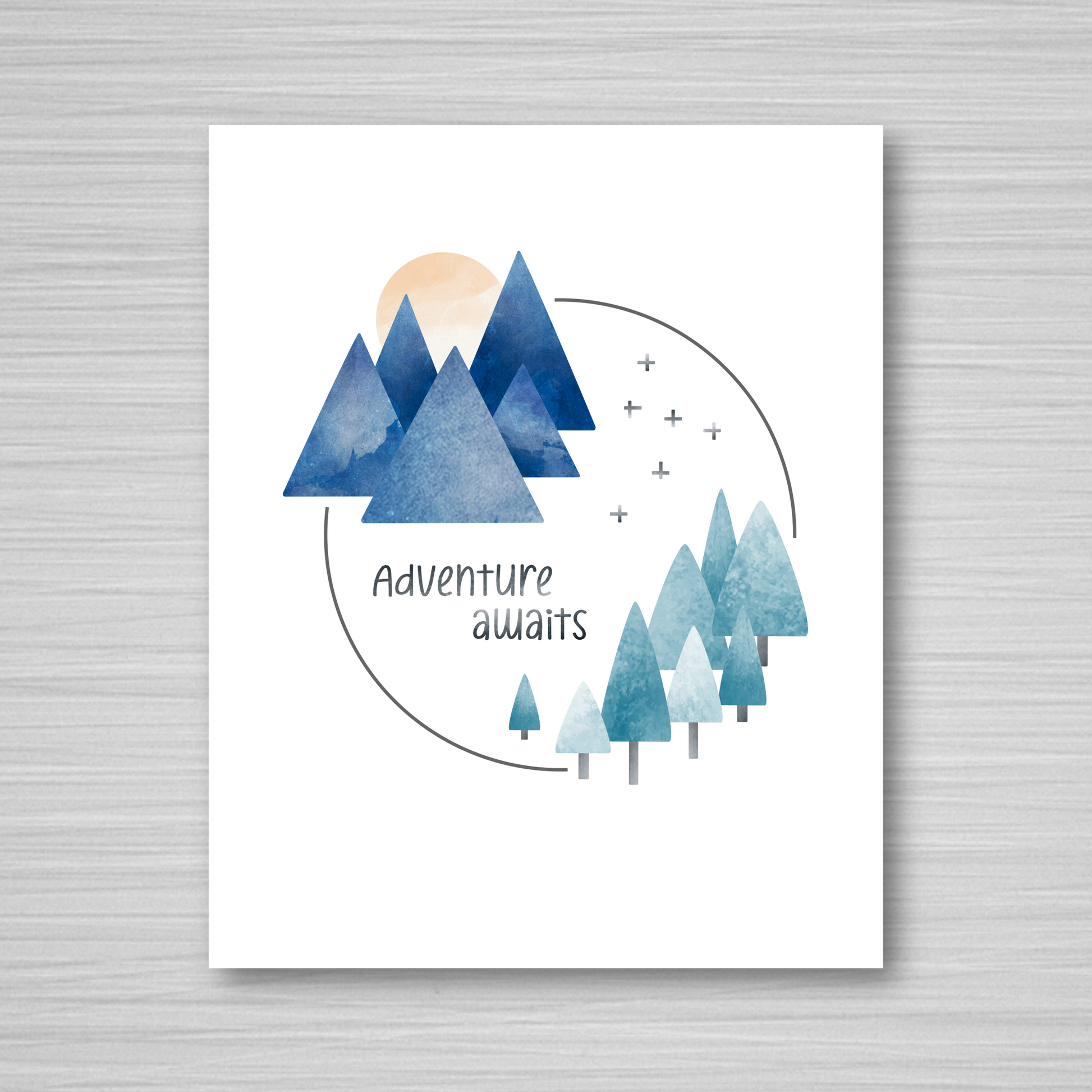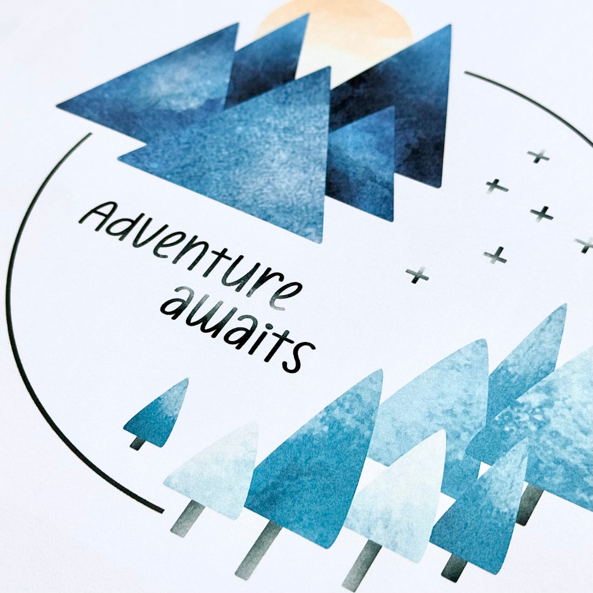 A fun print with mountains, trees, sun, and "Adventure Awaits," laid out in the shape of a circle. The colors in the design are a mix of greens, blues, pale yellow, and gray. It's an original design that's ready to frame, and the artwork is printed on archival heavyweight paper.