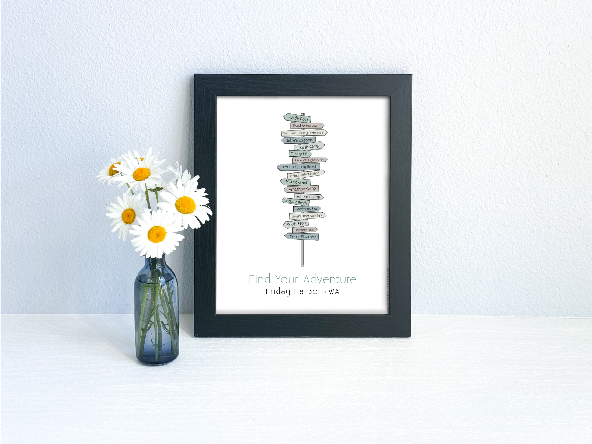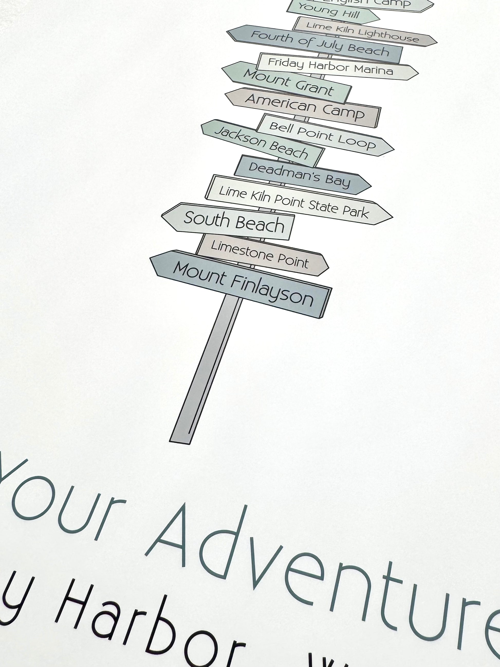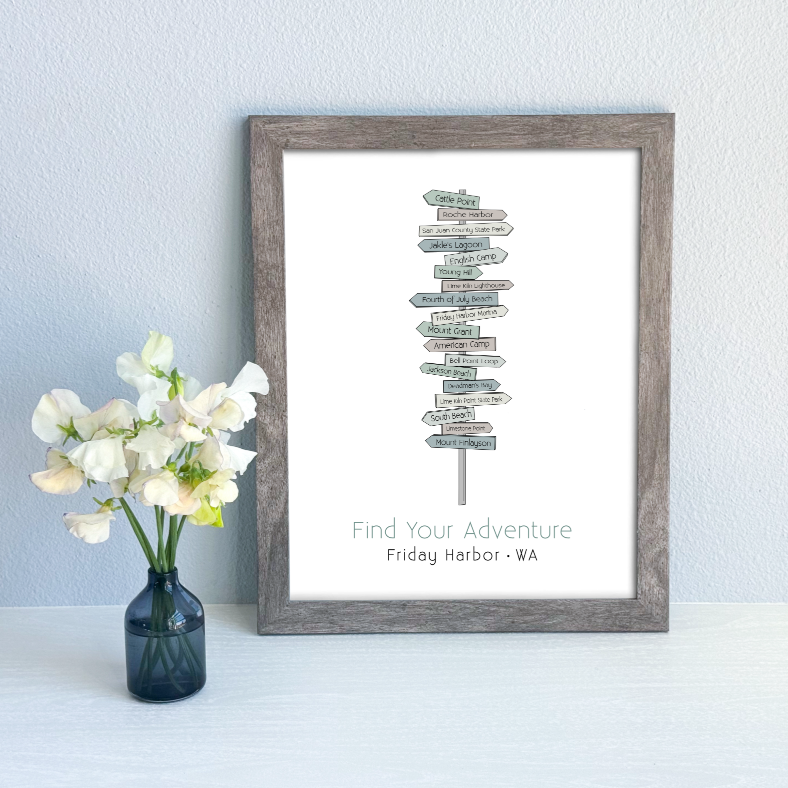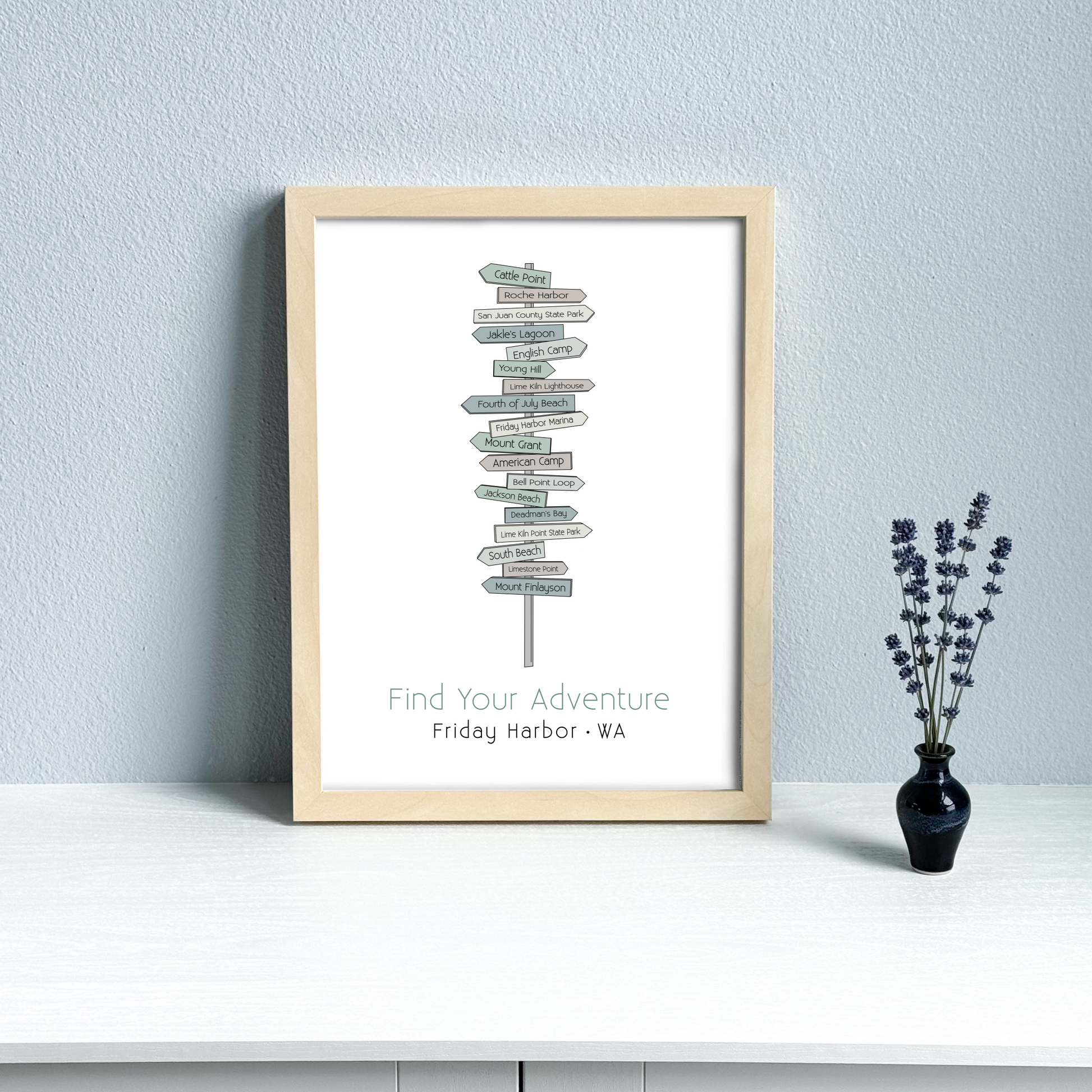 Find your adventure in and around Friday Harbor! So many amazing options for adventuring and exploring, it's hard to beat this island wonderland. This print features a beach rocks-inspired assortment of signs--blues, greens, browns, and grays. It's an original design that's ready to frame, and the artwork is printed on archival heavyweight paper.