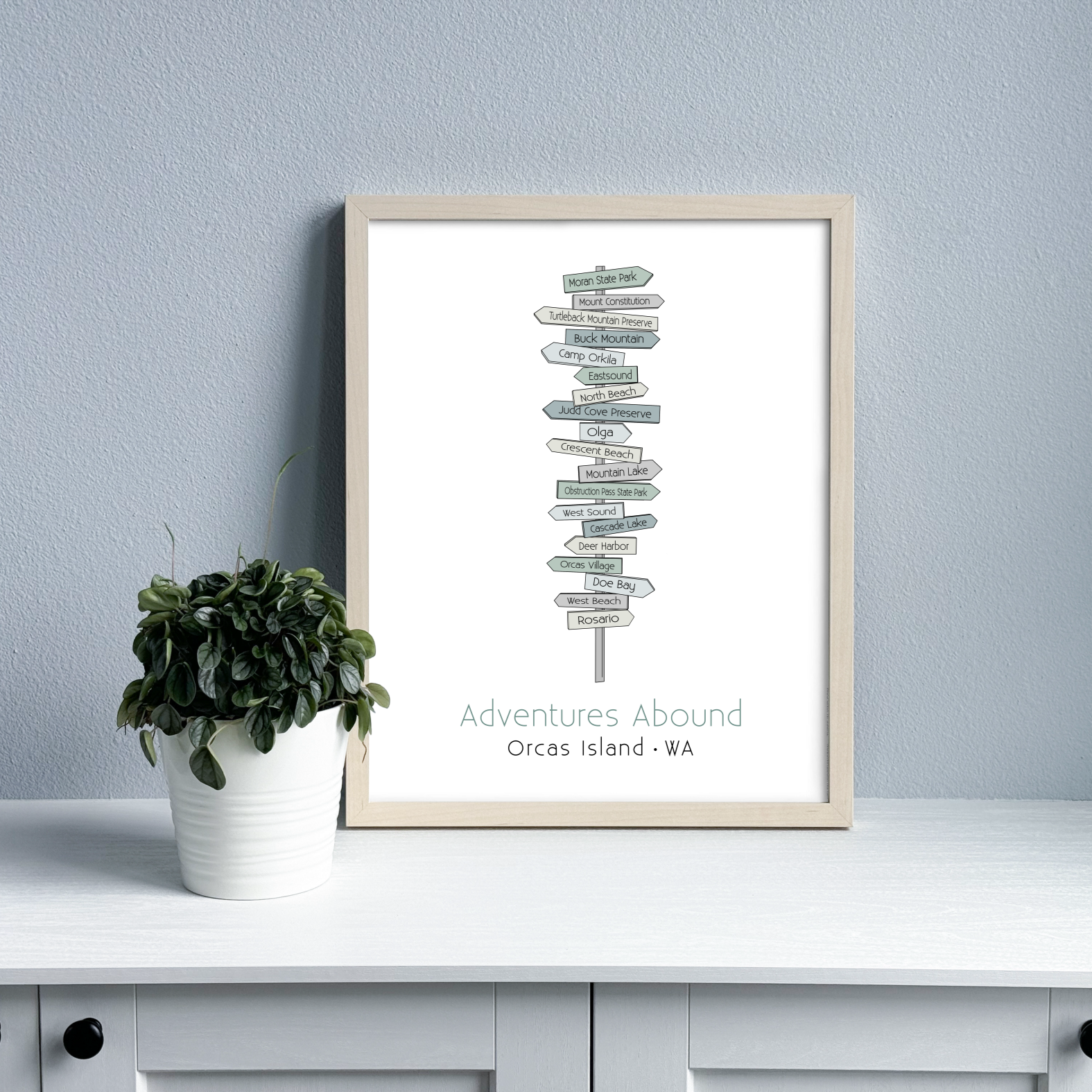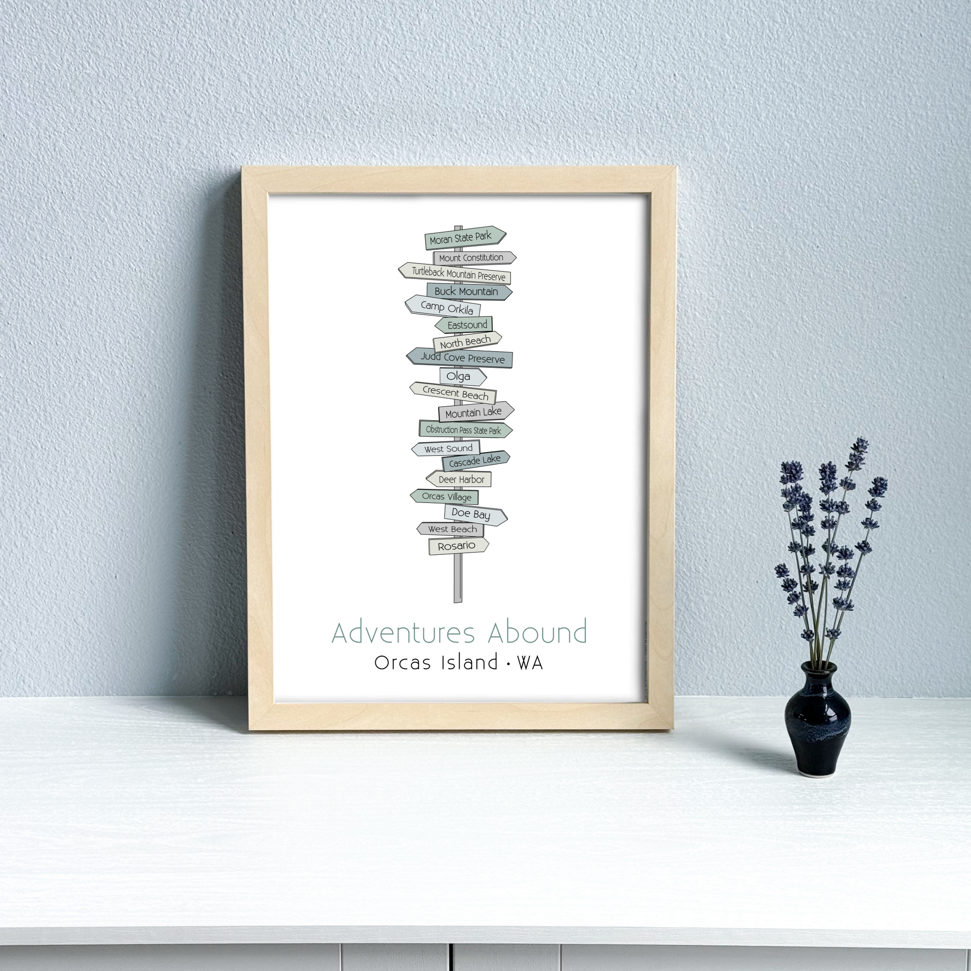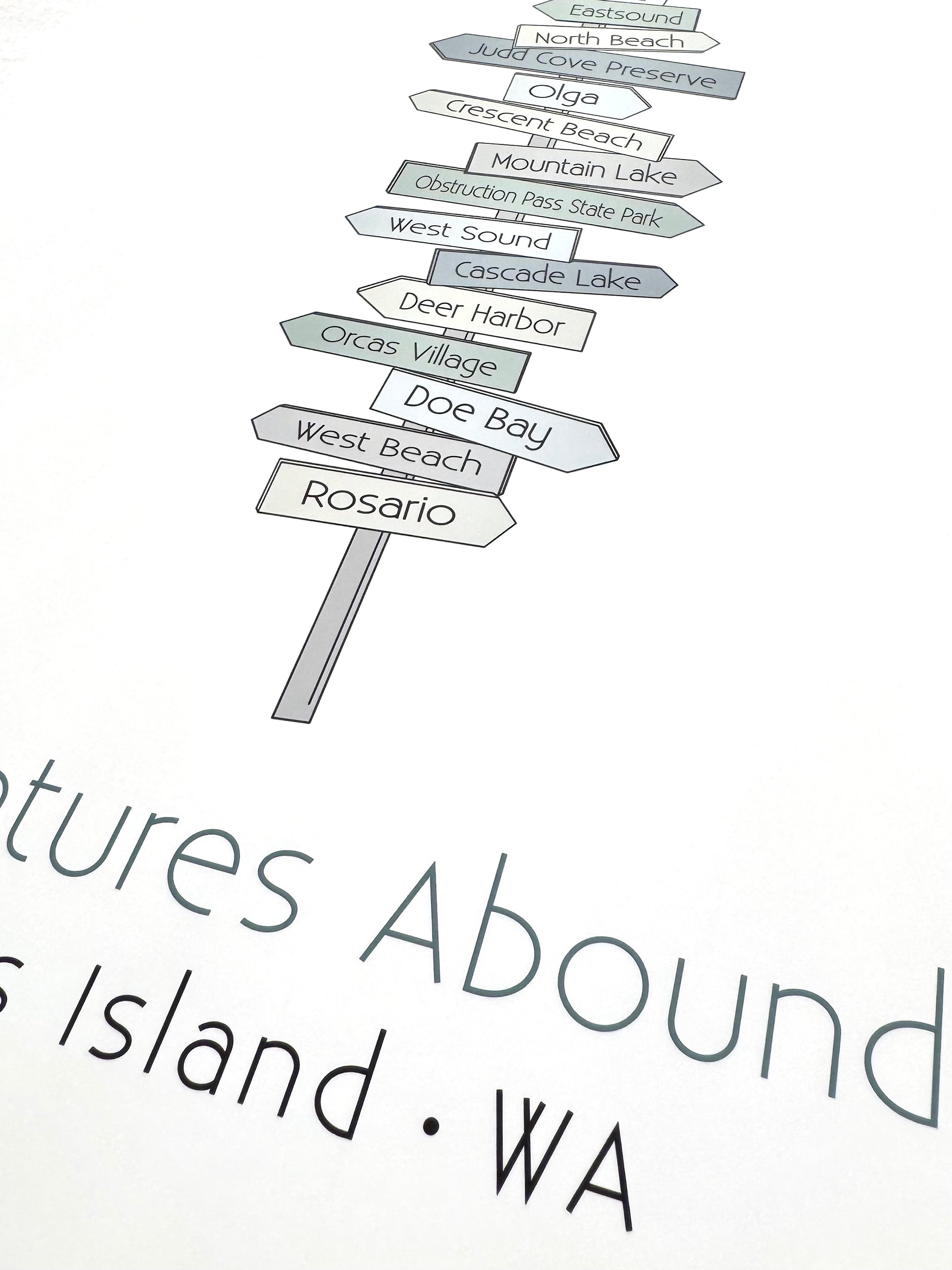 Adventures abound on Orcas Island! This island is a playground for adventuring and exploring, there's just so much to do. This print features a sea glass-inspired assortment of signs in shades of blue, green, and gray. It's an original design that's ready to frame, and the artwork is printed on archival heavyweight paper.