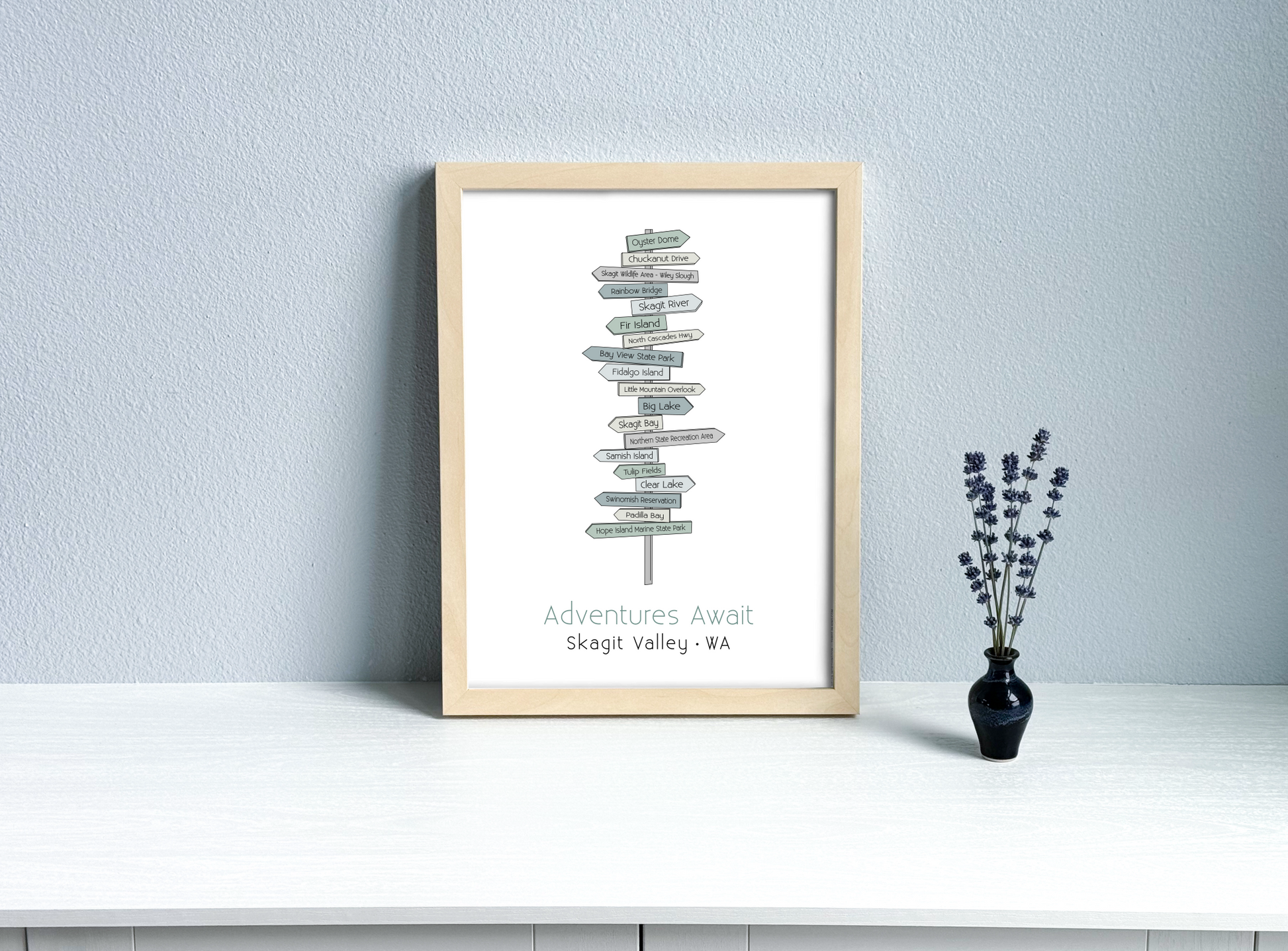 Adventures Await! Come explore all of the amazing outdoor recreation options in and around the beautiful Skagit Valley. This print features a sea glass-colored assortment of colors, including soft blues, greens, and grays. It's an original design that's ready to frame, and the artwork is printed on archival heavyweight paper.