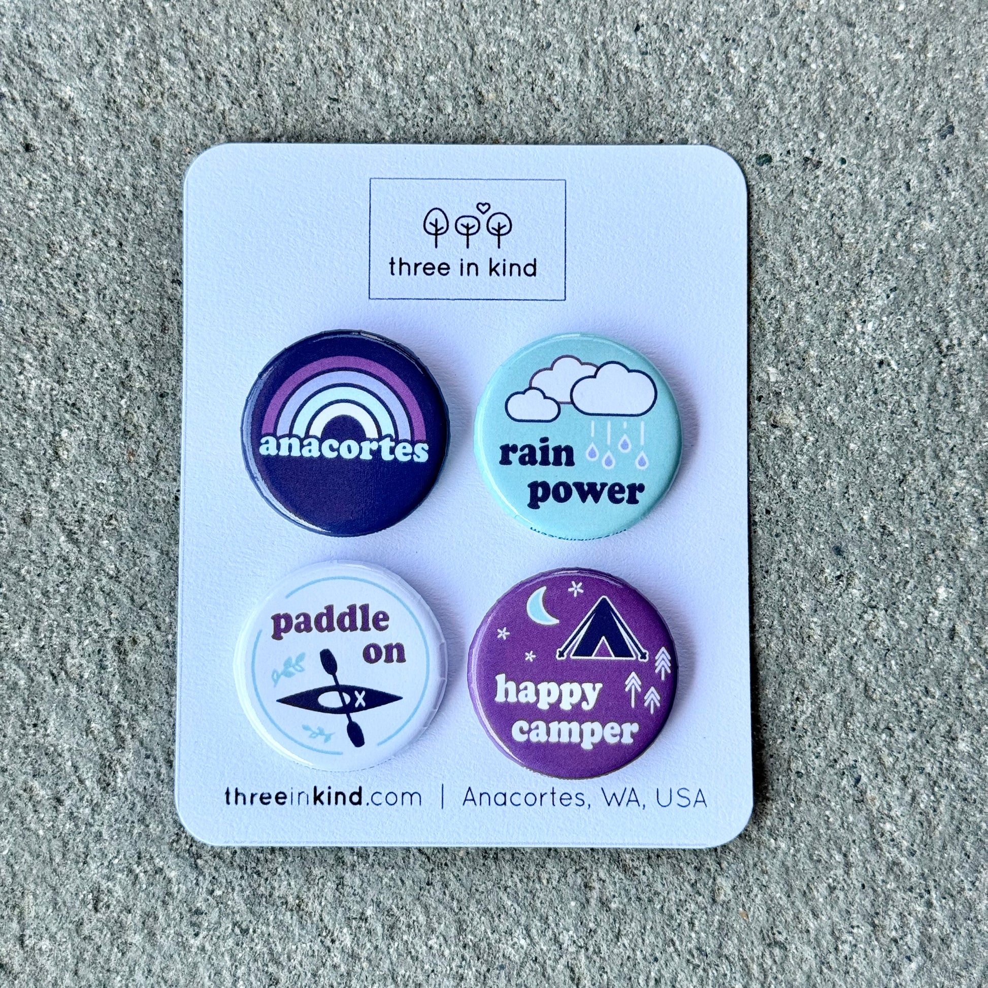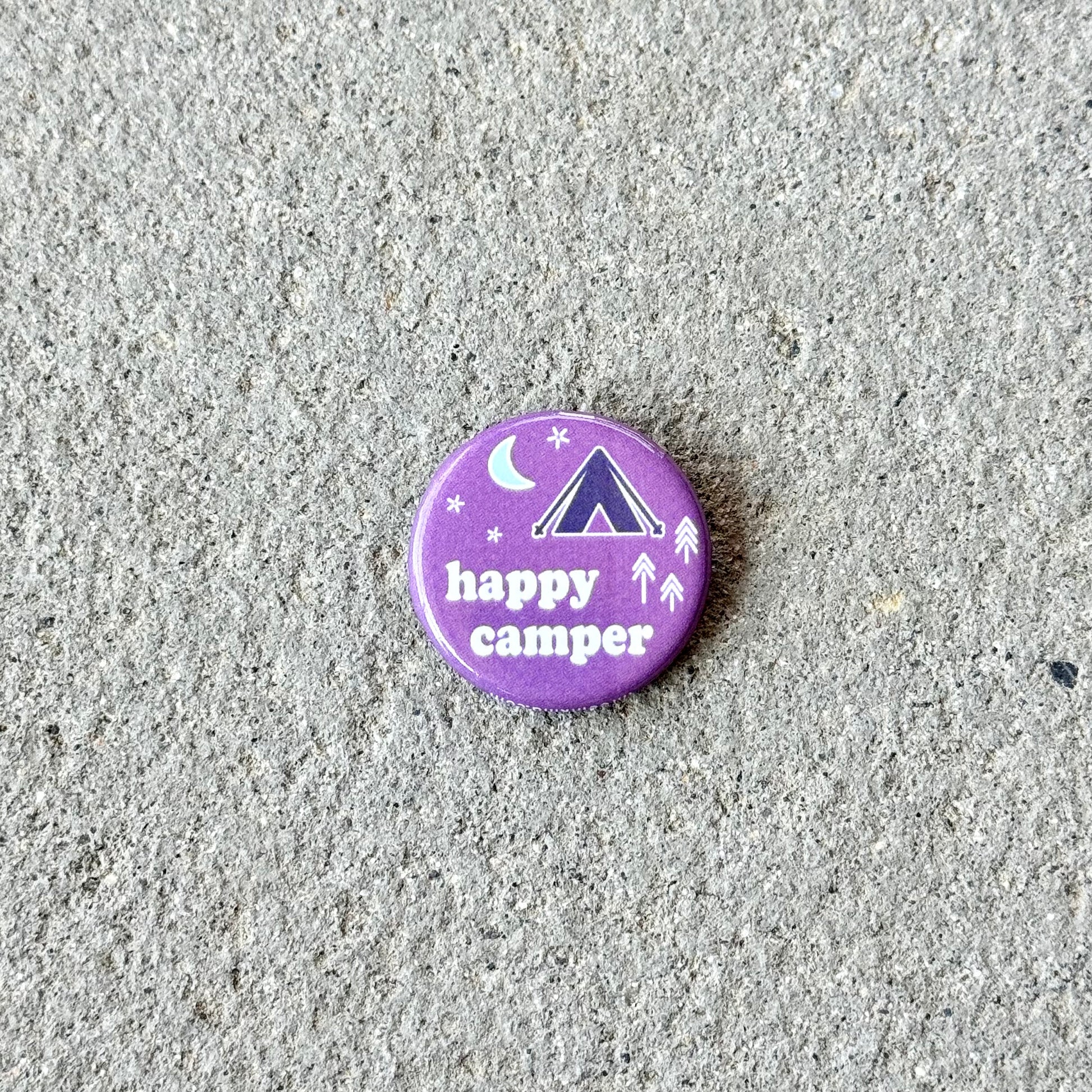 If camping is what brings you joy, I have the button for you! This pin features my original “happy camper” design, and coordinates with a lot of other pins and stickers in the shop. The colors are plum, navy blue, white, and mint.