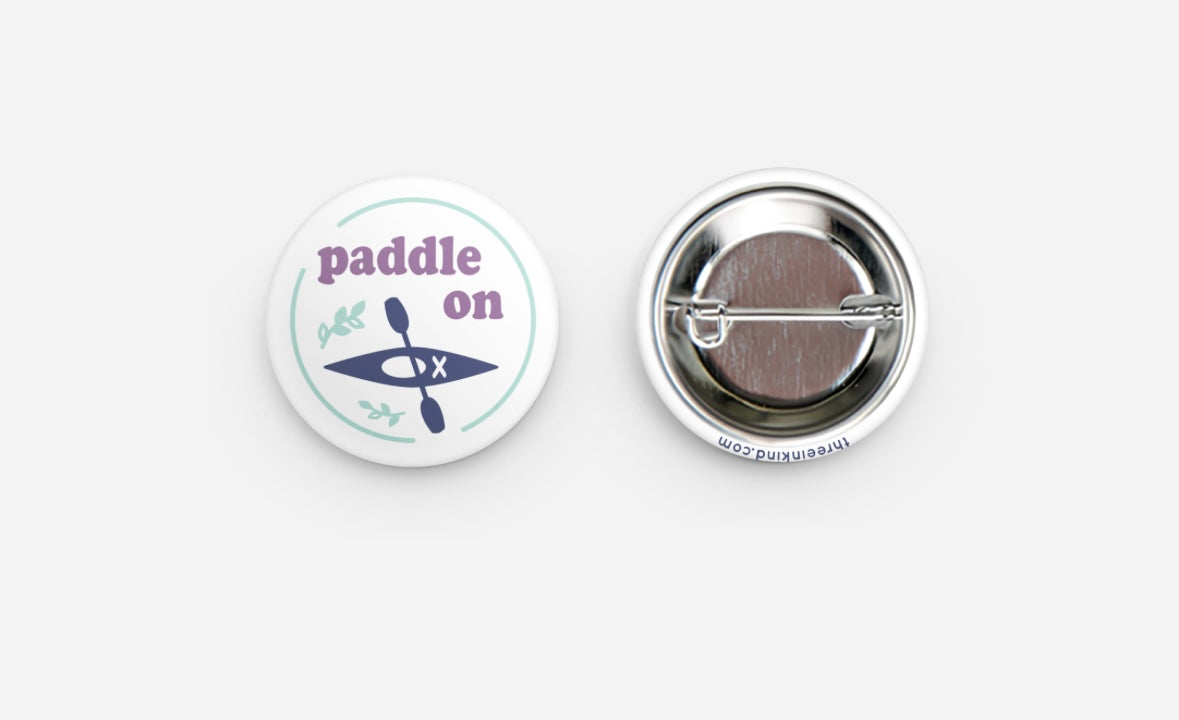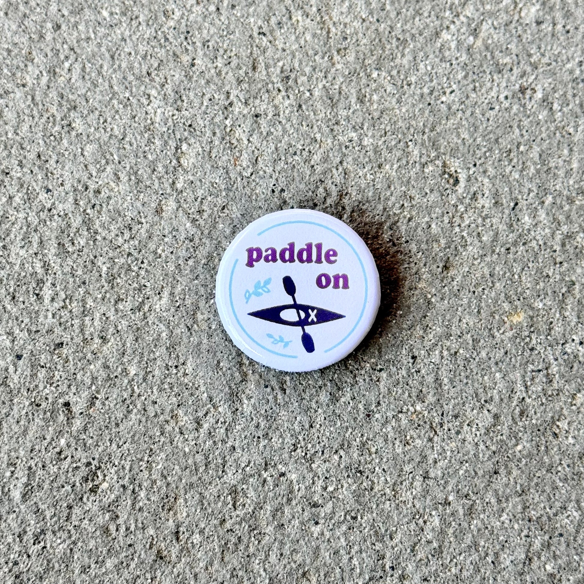 It’s hard to beat a day on the water for soothing the soul. This pin-back button with my original kayak and "paddle on" design is a perfect way to express that sentiment. The colors on the pin are navy blue, white, plum, and mint.