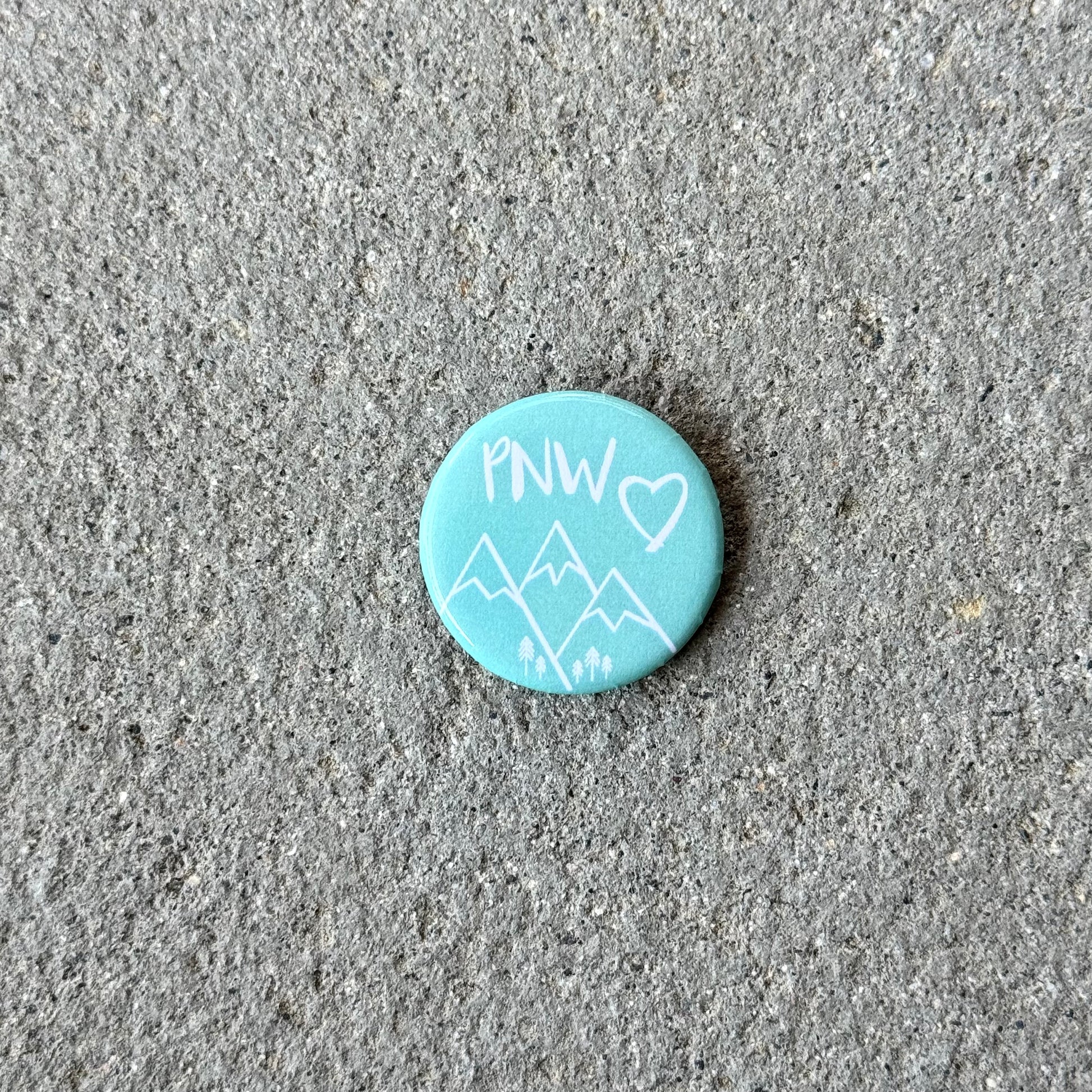 This pin-back button is perfect for showing off your love of the PNW! The design is completely original, and coordinates with my "Perfectly PNW" prints and stickers. The colors on the pin are mint green and white.
