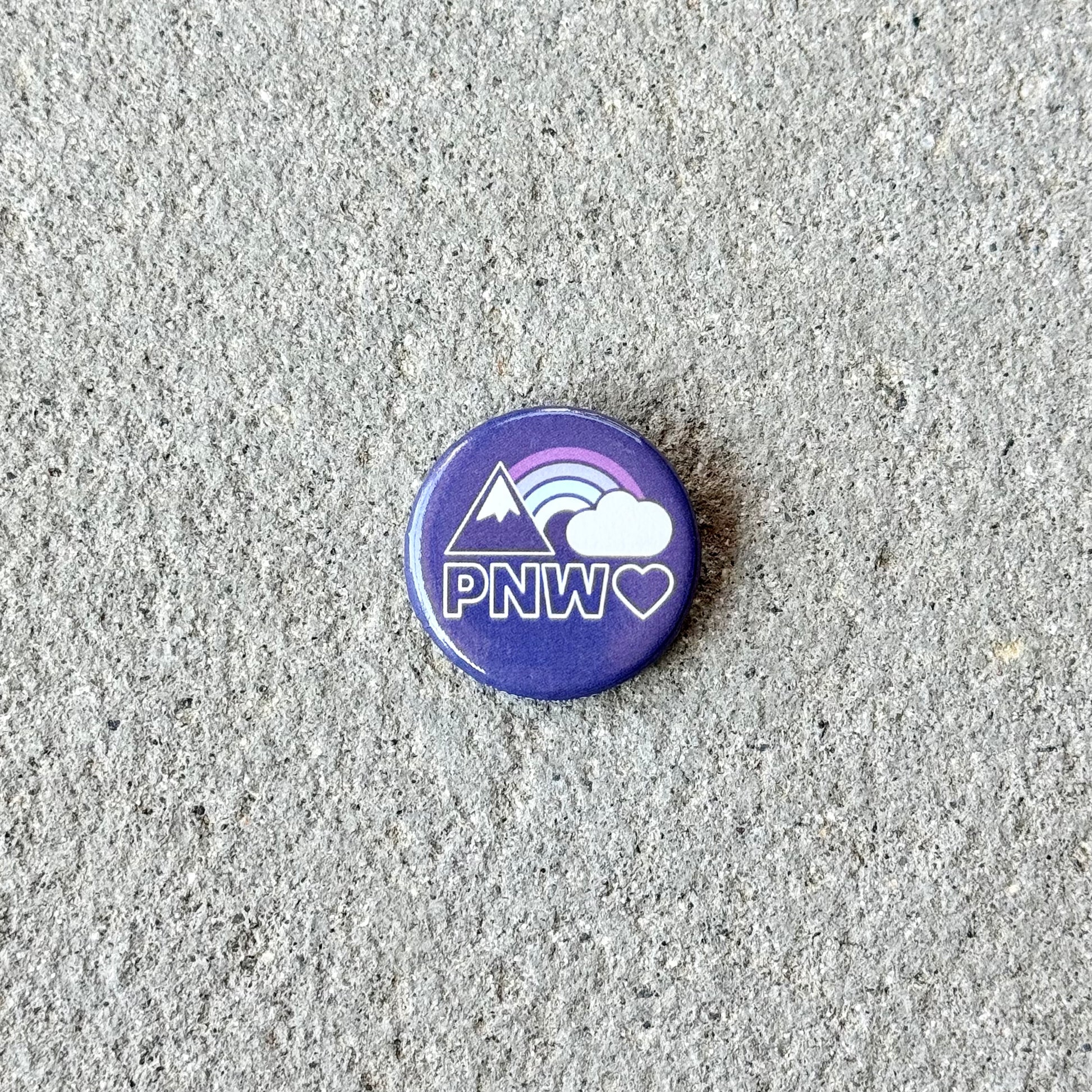 Do you love mountains, rainbows, AND the PNW?! Then this button is calling your name. The colors on the pin are navy blue, white, plum, periwinkle, and mint.