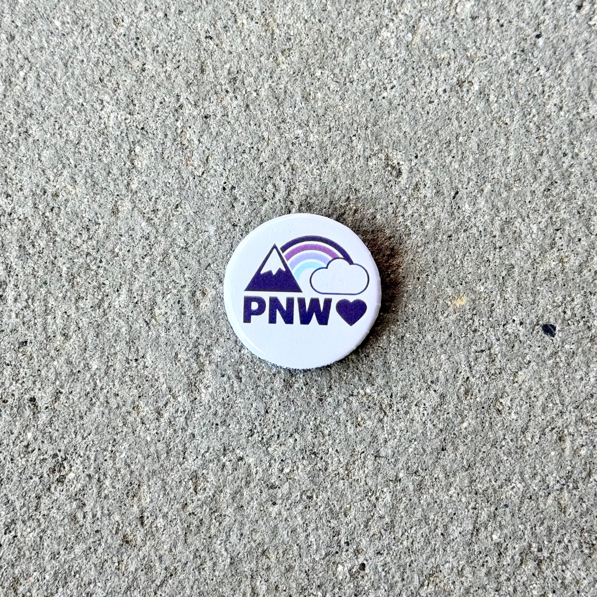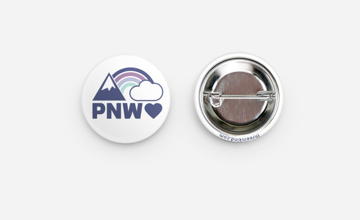 PNW + a rainbow?! It’s hard to beat this design, for sure. The colors on the pin are navy blue, white, plum, periwinkle, and mint.