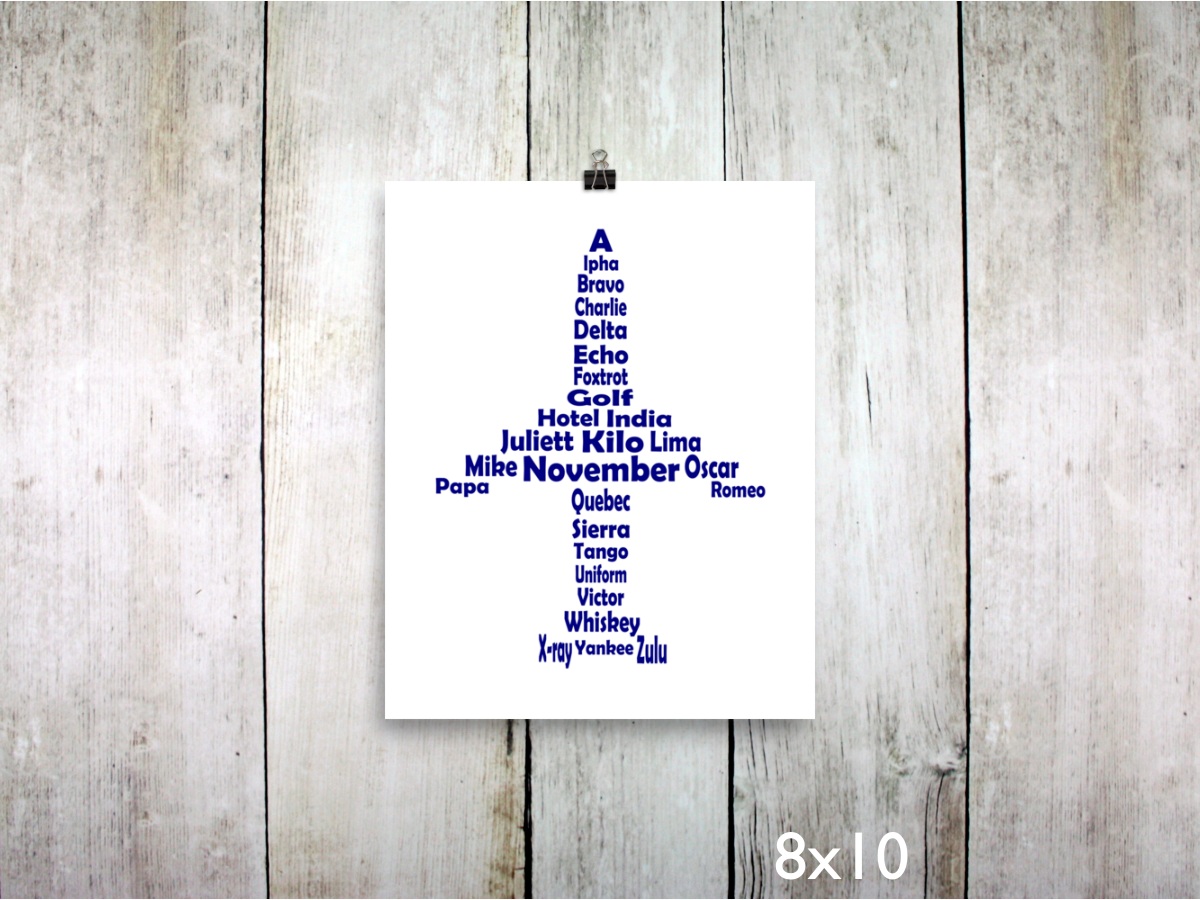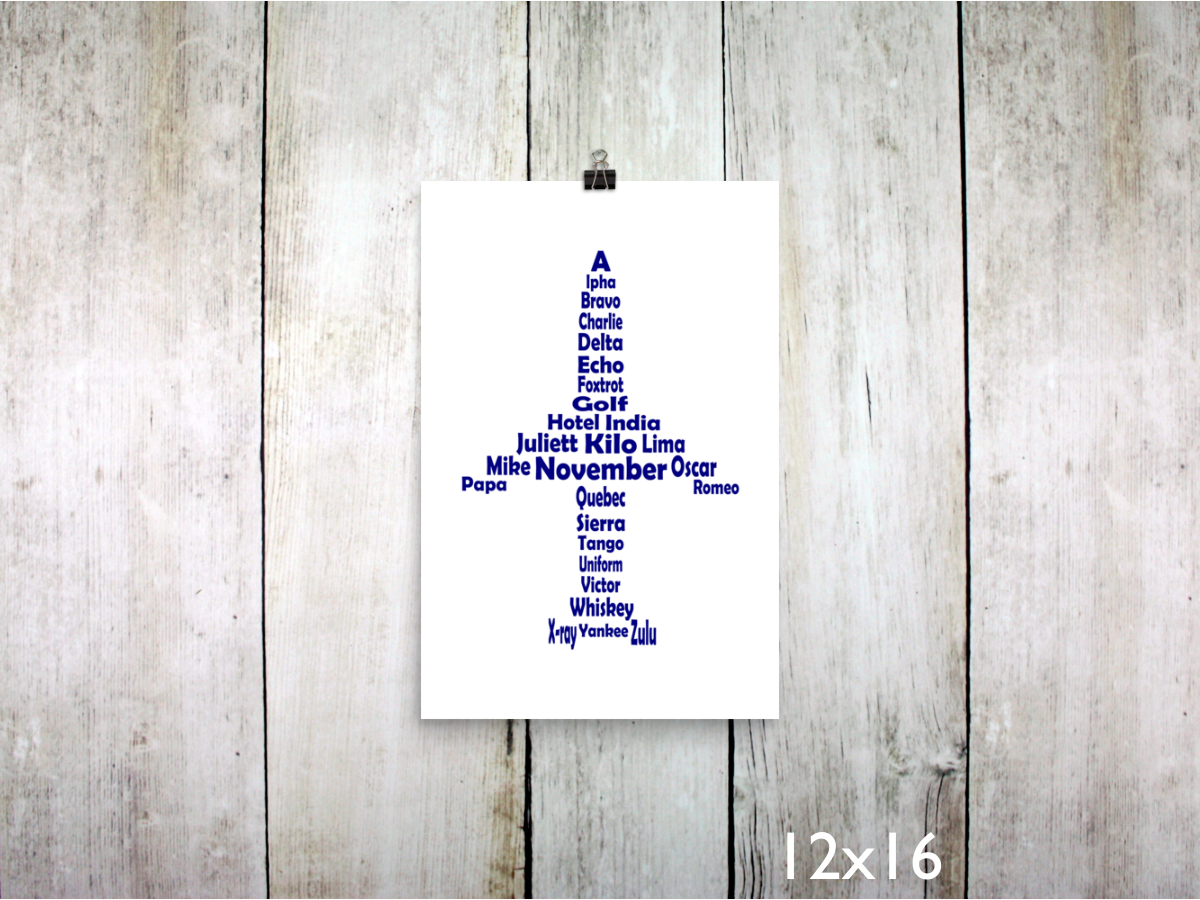 This is an original print of the NATO Phonetic Alphabet laid out in the shape of a jet airplane, in navy blue. It's ready to frame, and the artwork is printed on archival heavyweight paper.