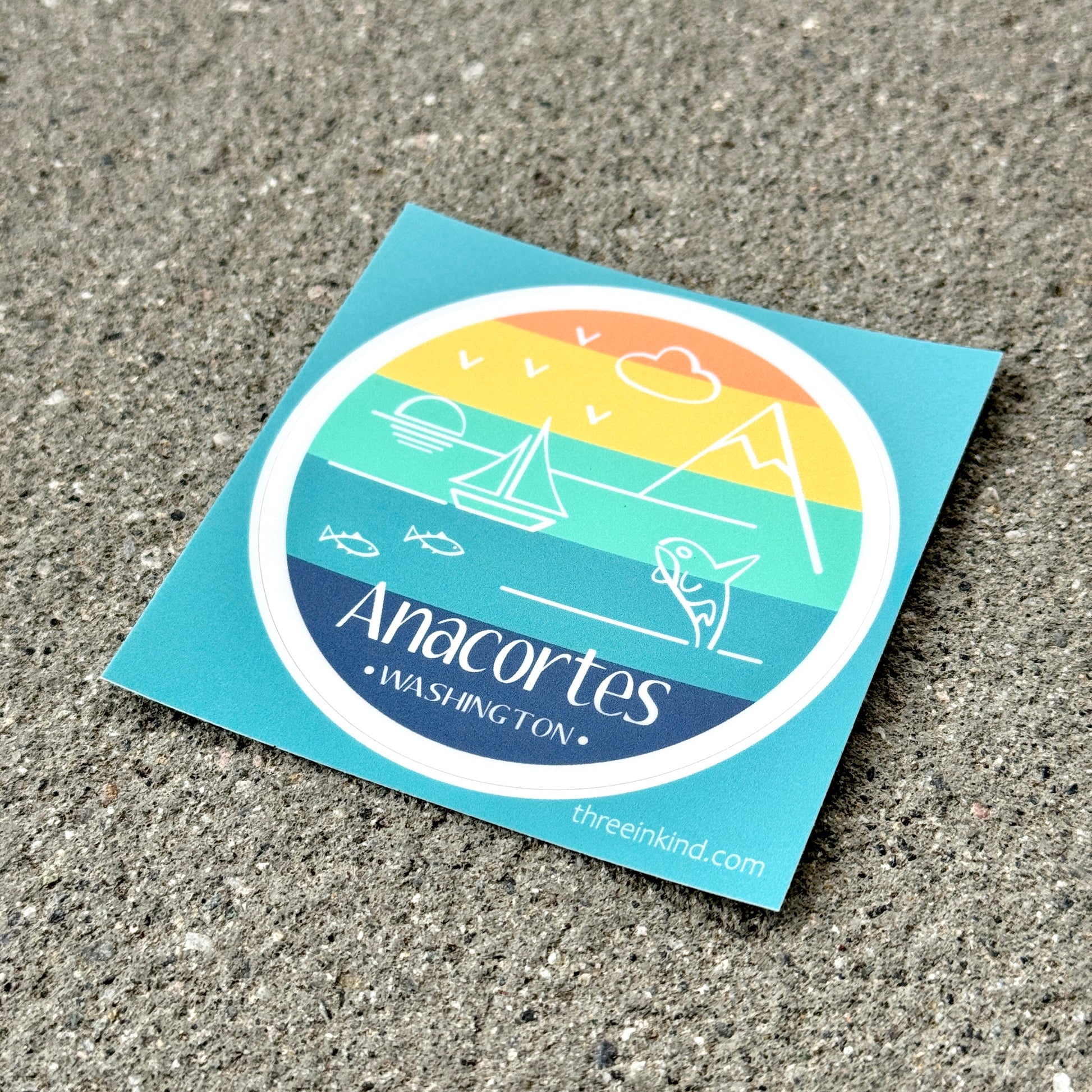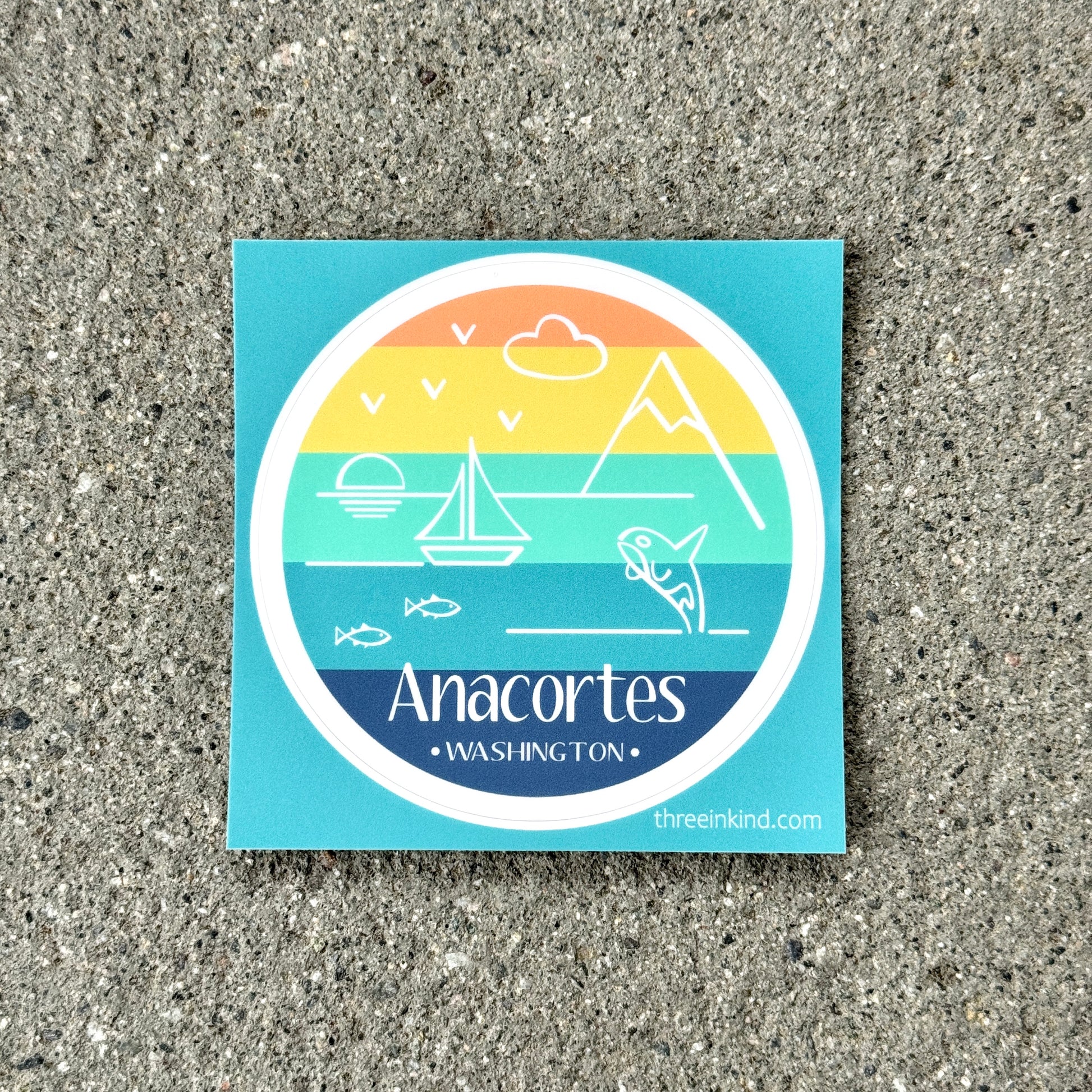 This round 3" sticker is perfect for showing off your love of Anacortes! The Anacortes Sunset design is completely original, and coordinates with my "Perfectly PNW" prints, stickers, and button pins. The colors on the sticker are orange, yellow, mint, blue, navy, and white.