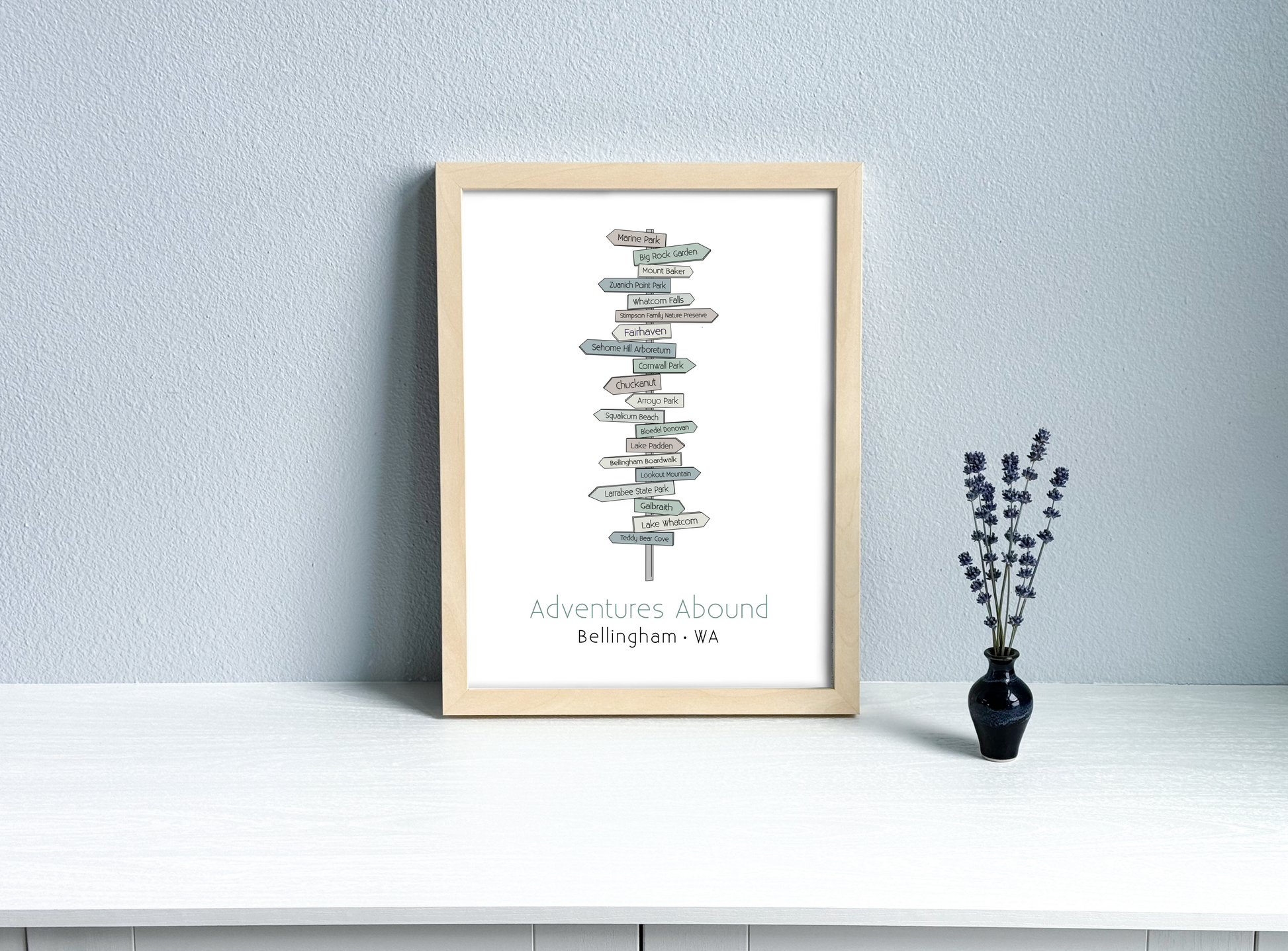 Adventures Abound in and around Bellingham! Come explore all of the amazing places to adventure in the outdoors around the the 'Ham. This print features a beach rocks-colored assortment of shades, including soft blues, greens, and browns. It's an original design that's ready to frame, and the artwork is printed on archival heavyweight paper.