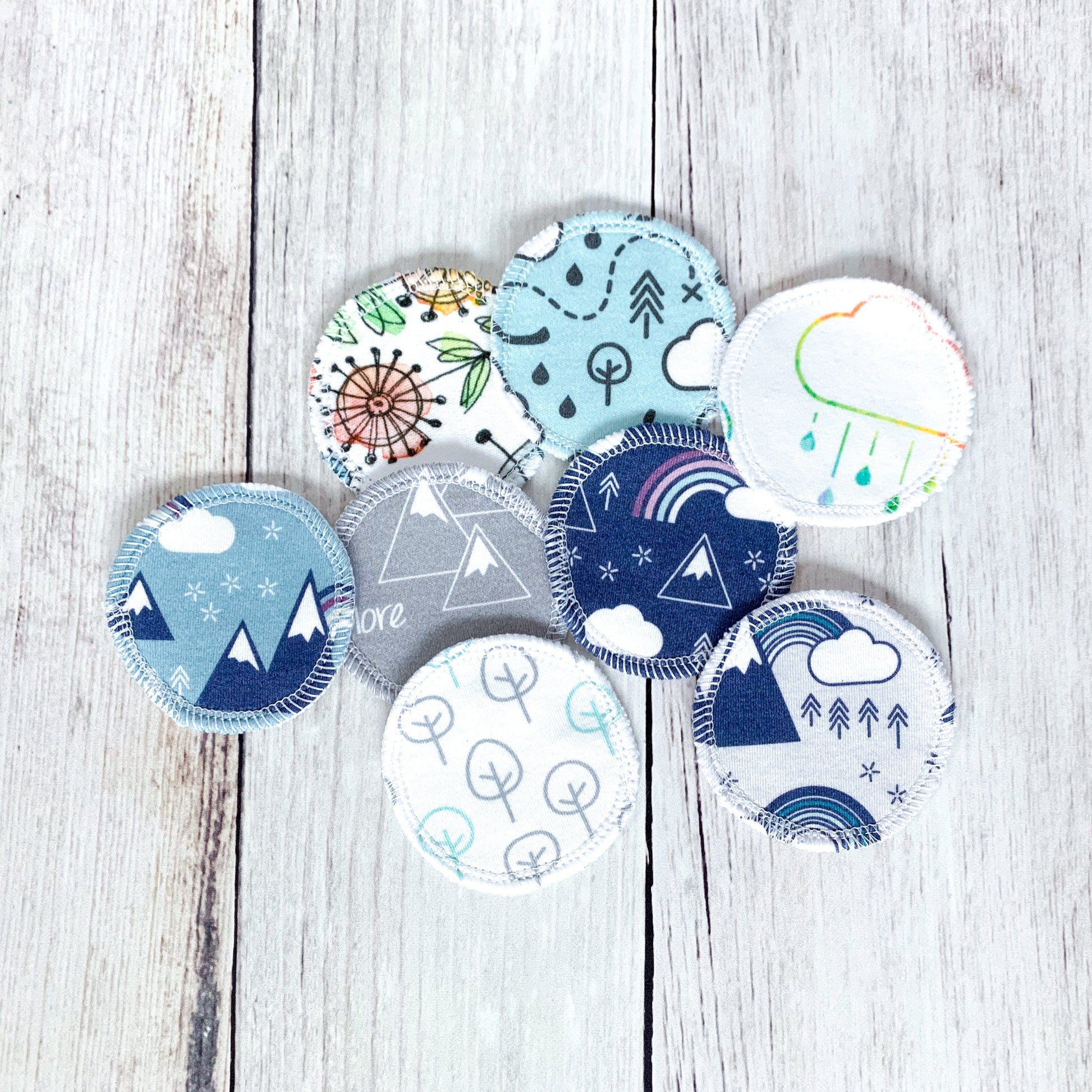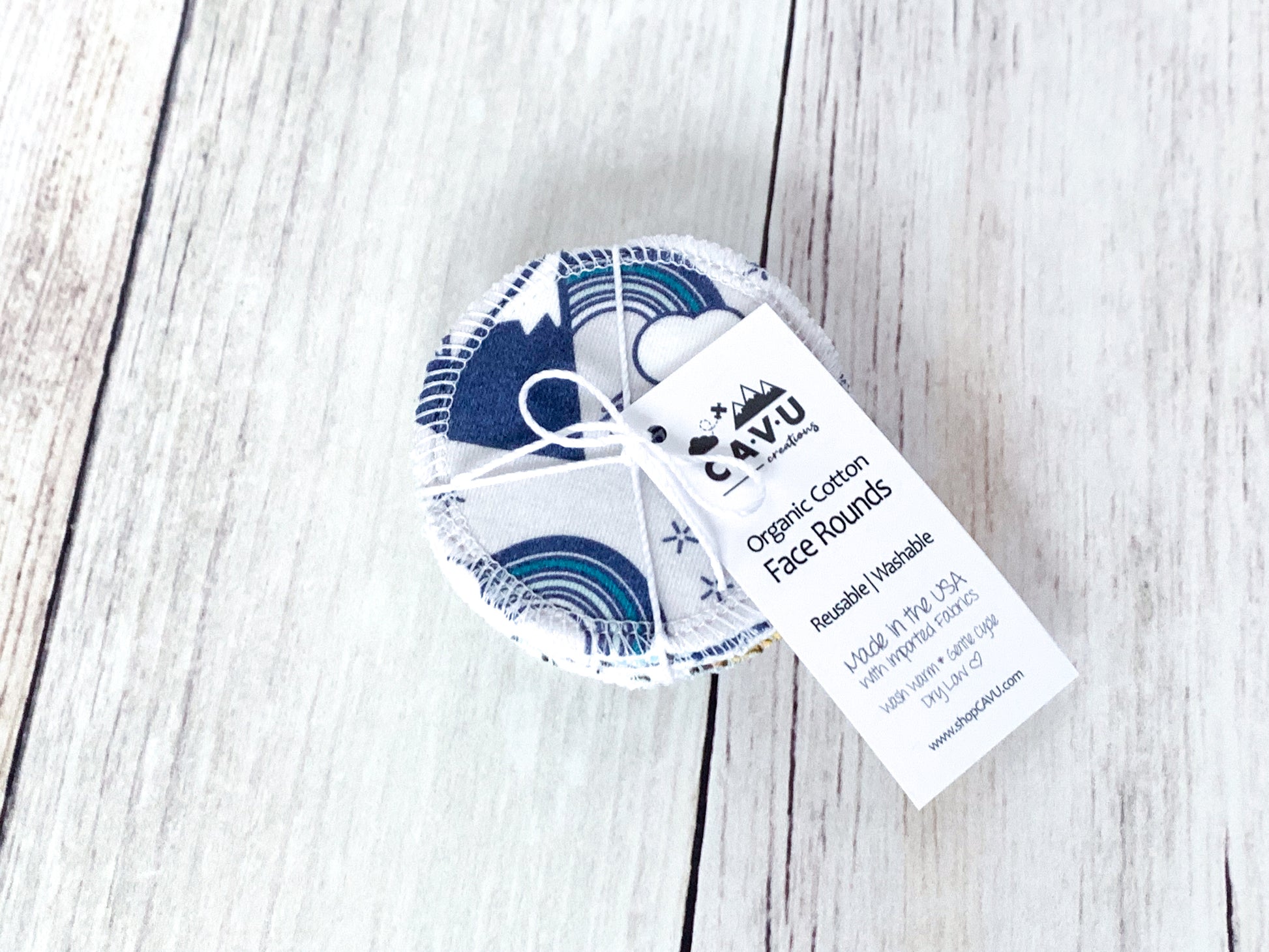 These rounds are handmade with two thick layers of 100% organic cotton fabric, securely joined with an overlocking stitch to give them a clean, finished edge that resists fraying. Each round measures just over 2.5” in diameter. One side has my exclusive prints on interlock fabric in a fun mix of clouds and rainbows in blues, teal, mint, rainbow, and gray. The reverse is premium white double-brushed flannel.