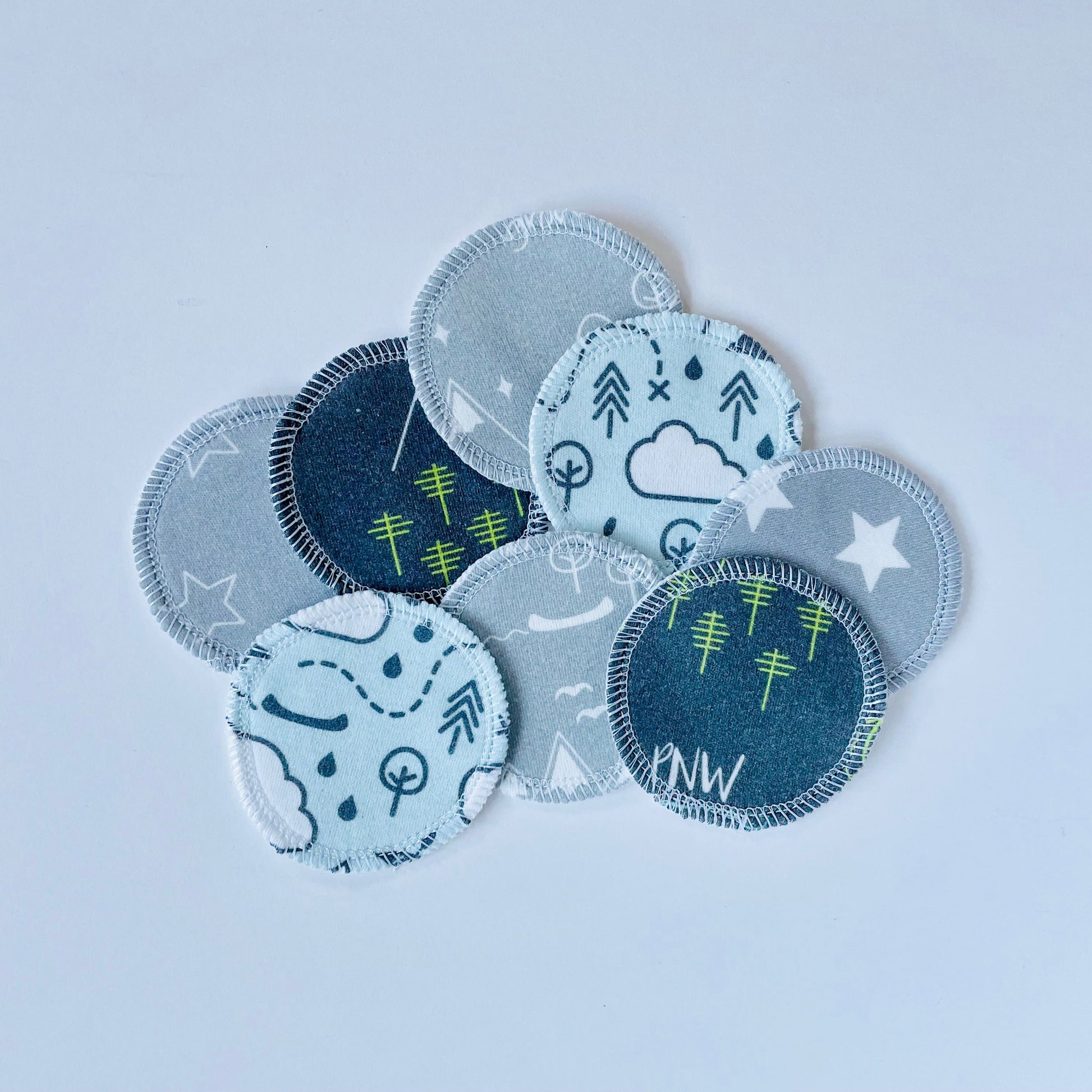 These rounds are handmade with two thick layers of 100% organic cotton fabric, securely joined with an overlocking stitch to give them a clean, finished edge that resists fraying. Each round measures just over 2.5” in diameter. One side has my exclusive prints on interlock fabric in a fun mix of mountains, clouds, and PNW, in green, blue, mint, and gray. The reverse is premium white double-brushed flannel.