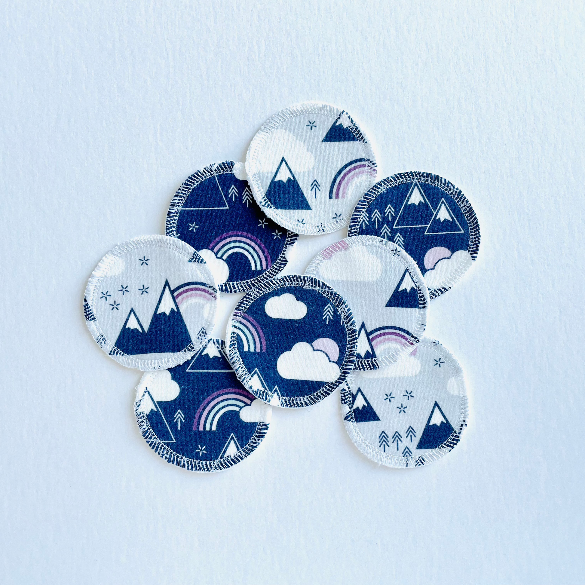 These rounds are handmade with two thick layers of 100% organic cotton fabric, securely joined with an overlocking stitch to give them a clean, finished edge that resists fraying. Each round measures just over 2.5” in diameter. One side has my exclusive Rainbows + Mountains print on interlock fabric in a fun mix of mountains, clouds, and rainbows in navy, plum, rainbow, and gray. The reverse is premium white double-brushed flannel.