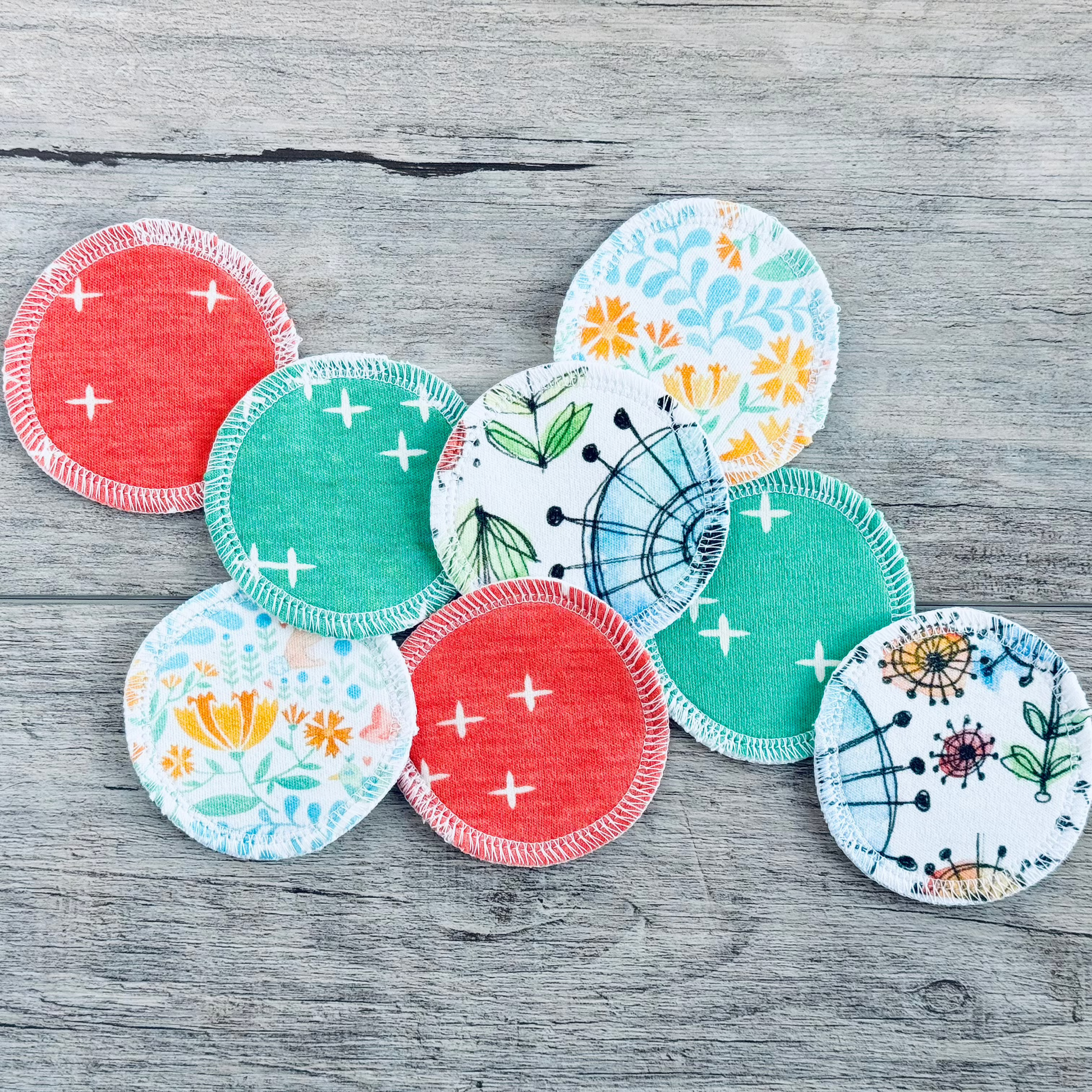 These rounds are handmade with two thick layers of 100% organic cotton fabric, securely joined with an overlocking stitch to give them a clean, finished edge that resists fraying. Each round measures just over 2.5” in diameter. One side has fun multi-colored prints on interlock fabric in a fun mix of coral, teal, and rainbow colors. The reverse is premium white double-brushed flannel.