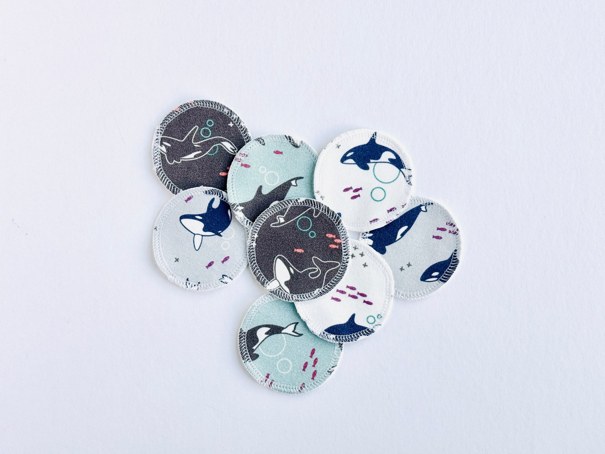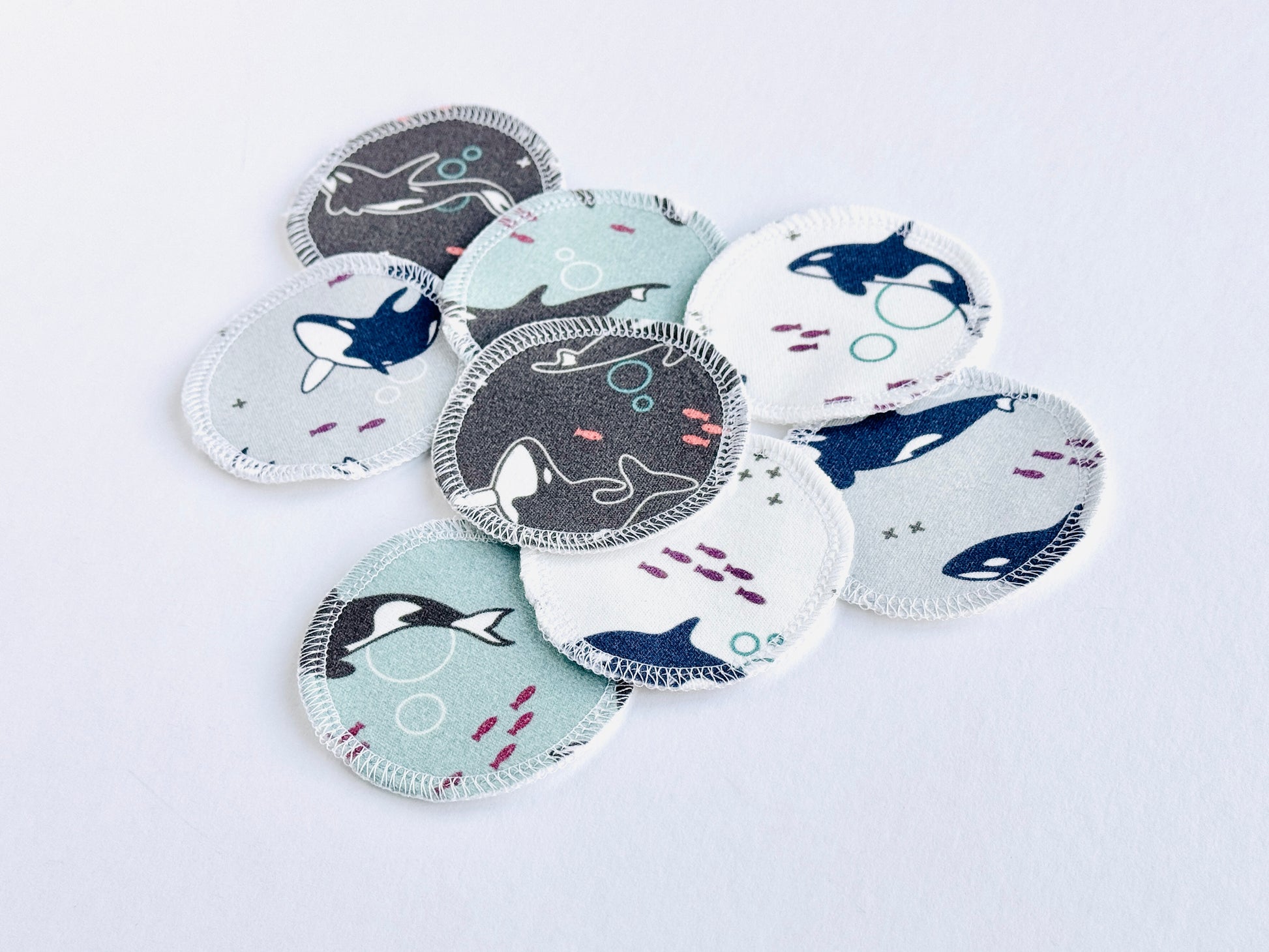 These rounds are handmade with two thick layers of 100% organic cotton fabric, securely joined with an overlocking stitch to give them a clean, finished edge that resists fraying. Each round measures just over 2.5” in diameter. One side has my exclusive prints on interlock fabric in a fun, colorful mix of orca whales. The reverse is premium white double-brushed flannel.