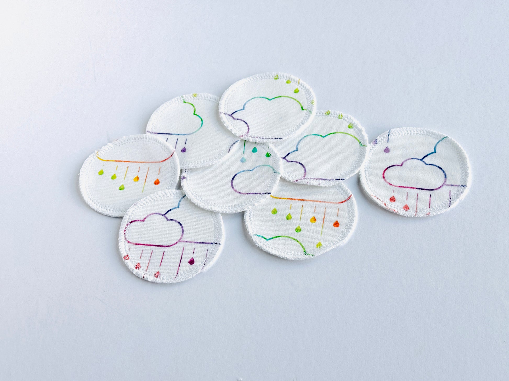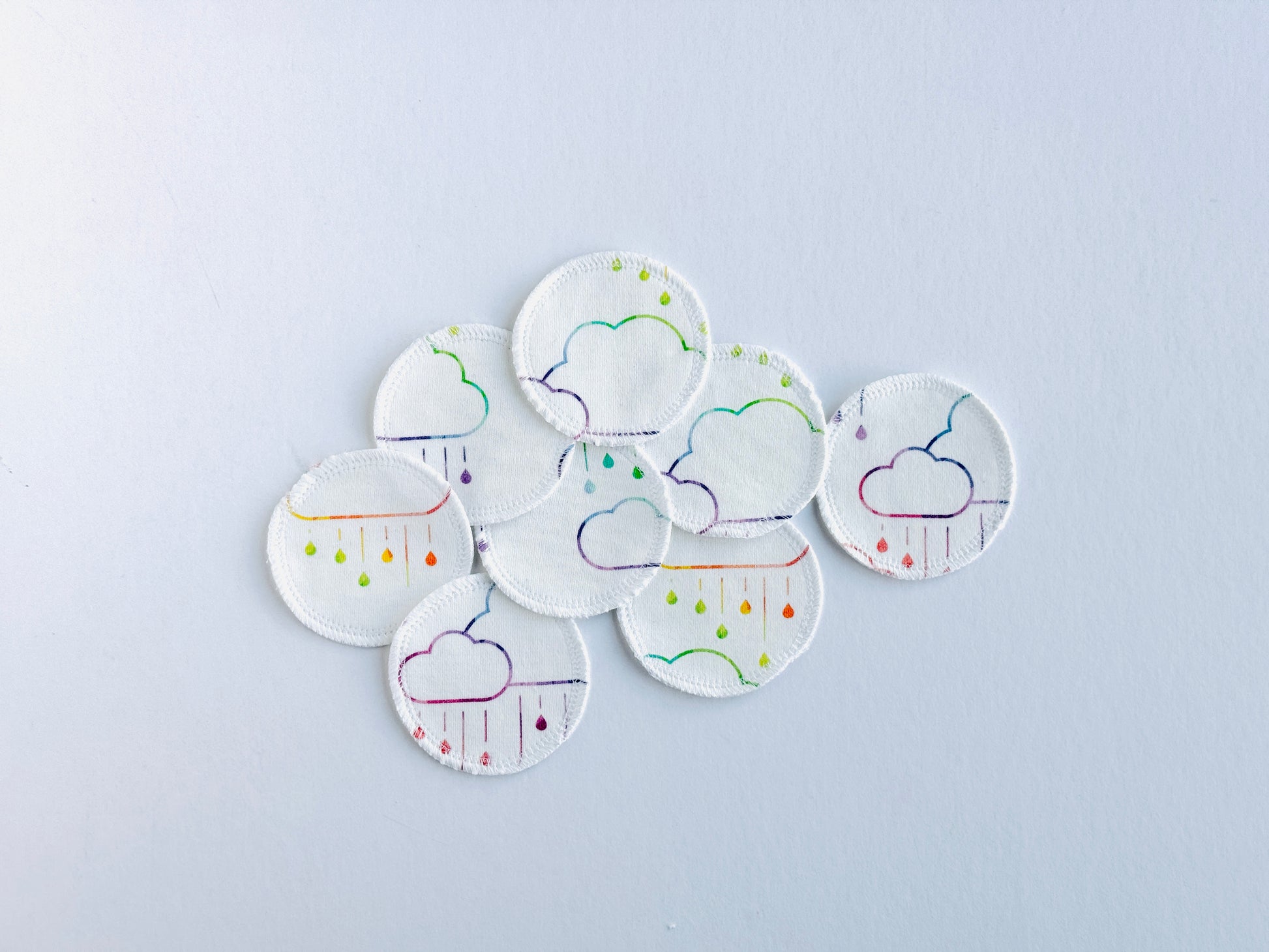 These rounds are handmade with two thick layers of 100% organic cotton fabric, securely joined with an overlocking stitch to give them a clean, finished edge that resists fraying. Each round measures just over 2.5” in diameter. One side has my exclusive rainbow raincloud print on interlock fabric. The reverse is premium white double-brushed flannel.