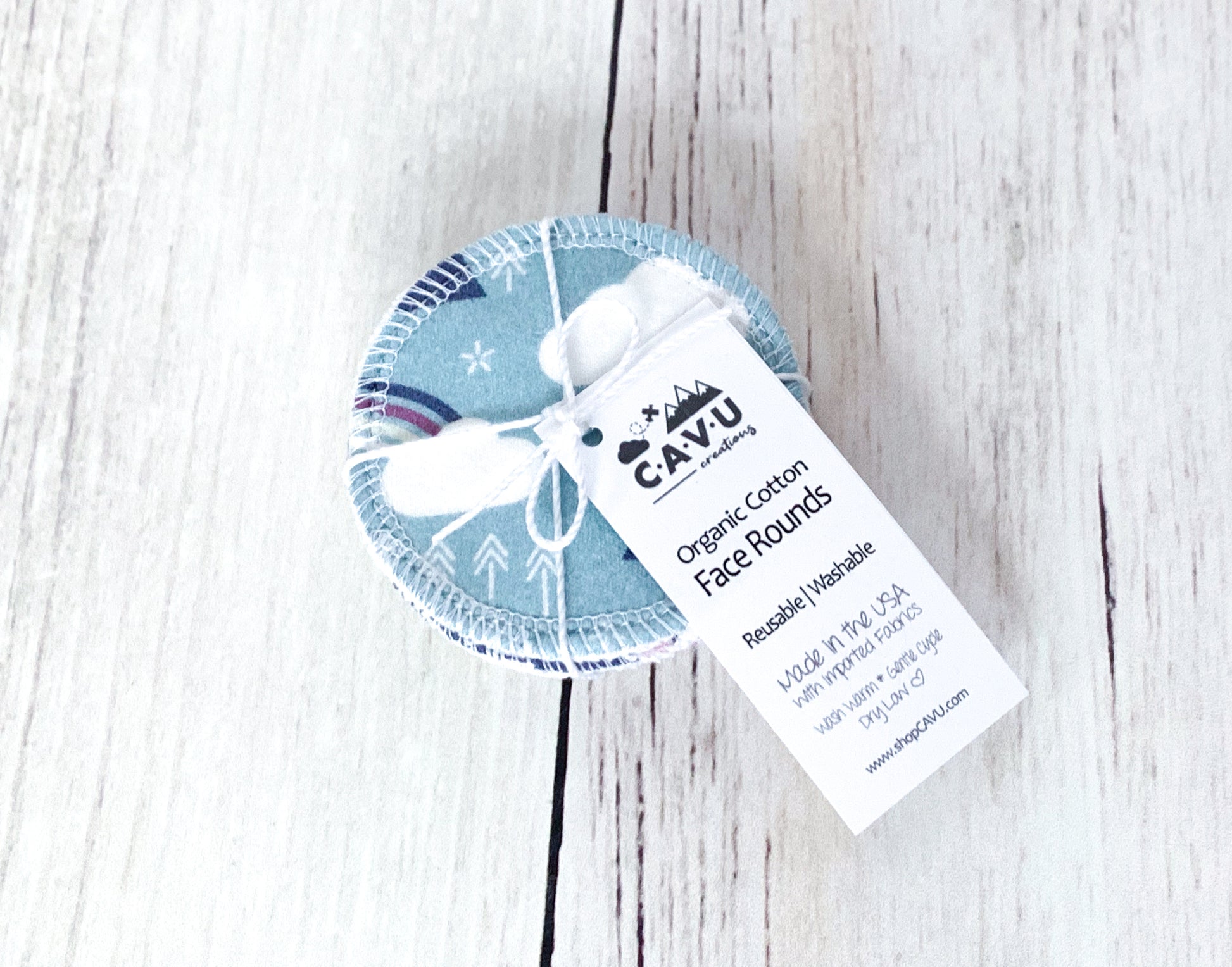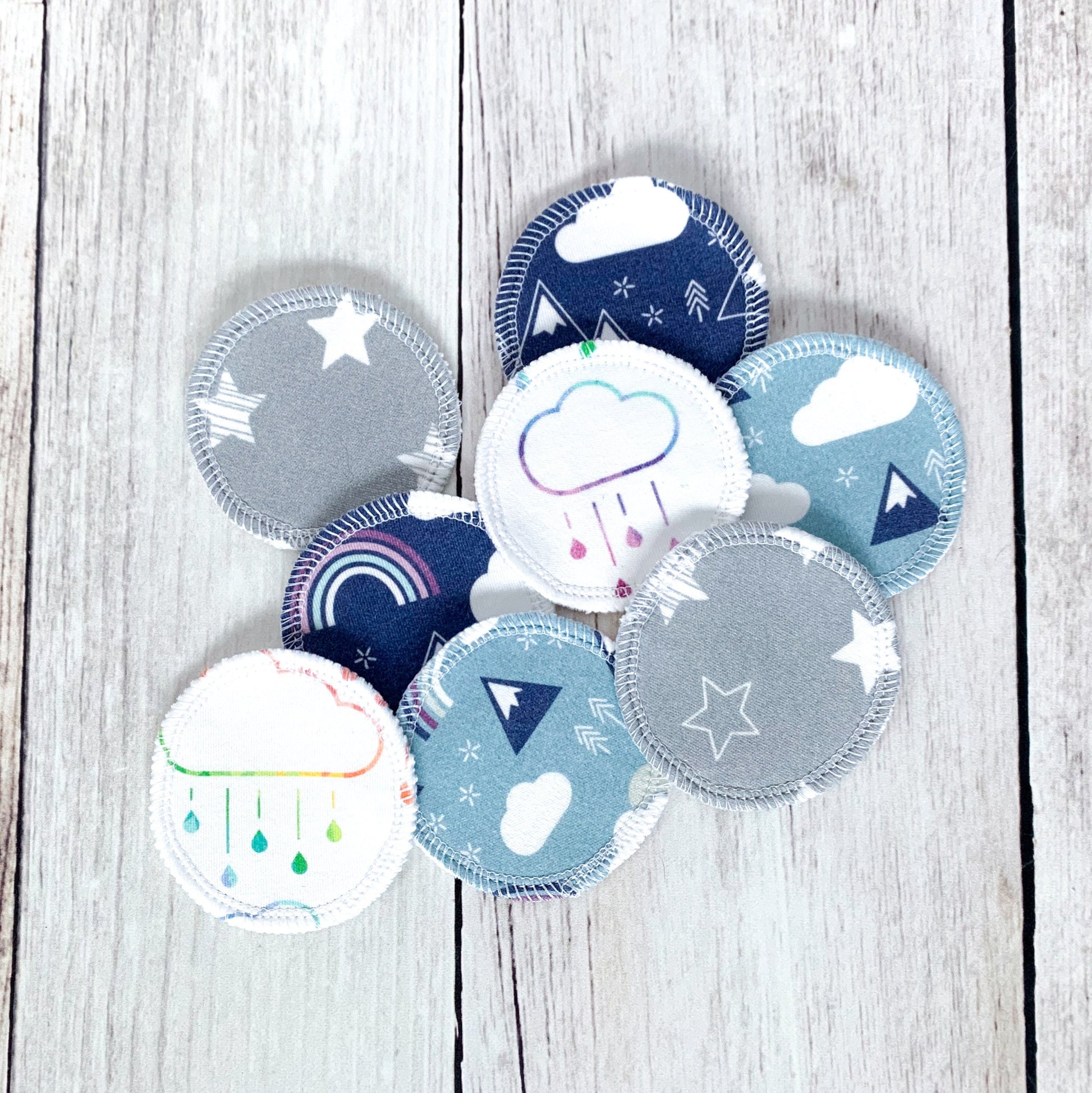 These rounds are handmade with two thick layers of 100% organic cotton fabric, securely joined with an overlocking stitch to give them a clean, finished edge that resists fraying. Each round measures just over 2.5” in diameter. One side has my exclusive prints on interlock fabric in a fun mix of clouds and rainbows in blues, teal, rainbow, and gray. The reverse is premium white double-brushed flannel.