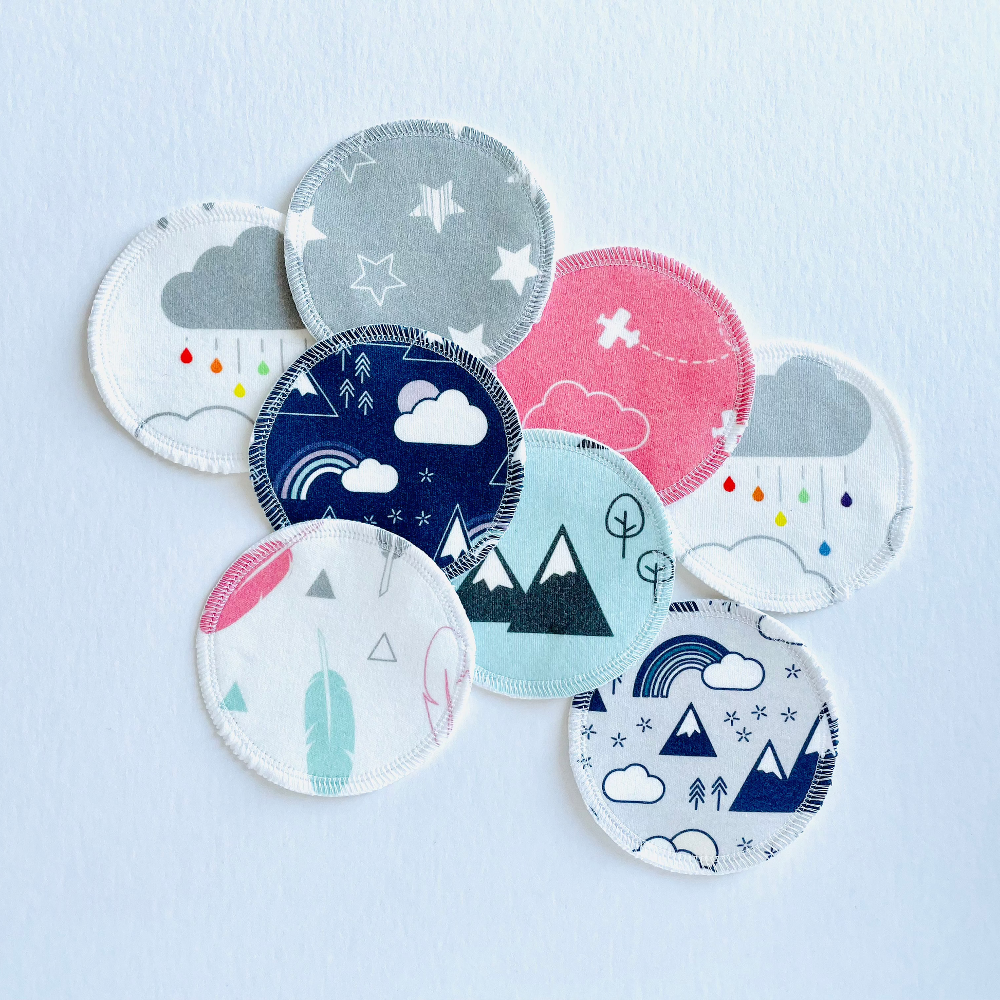 These rounds are handmade with two thick layers of 100% organic cotton fabric, securely joined with an overlocking stitch giving them a clean, finished edge that resists fraying. Each round measures just over 3.5” in diameter. One side has my exclusive and colorful prints on interlock fabric. The reverse is premium white double-brushed flannel.