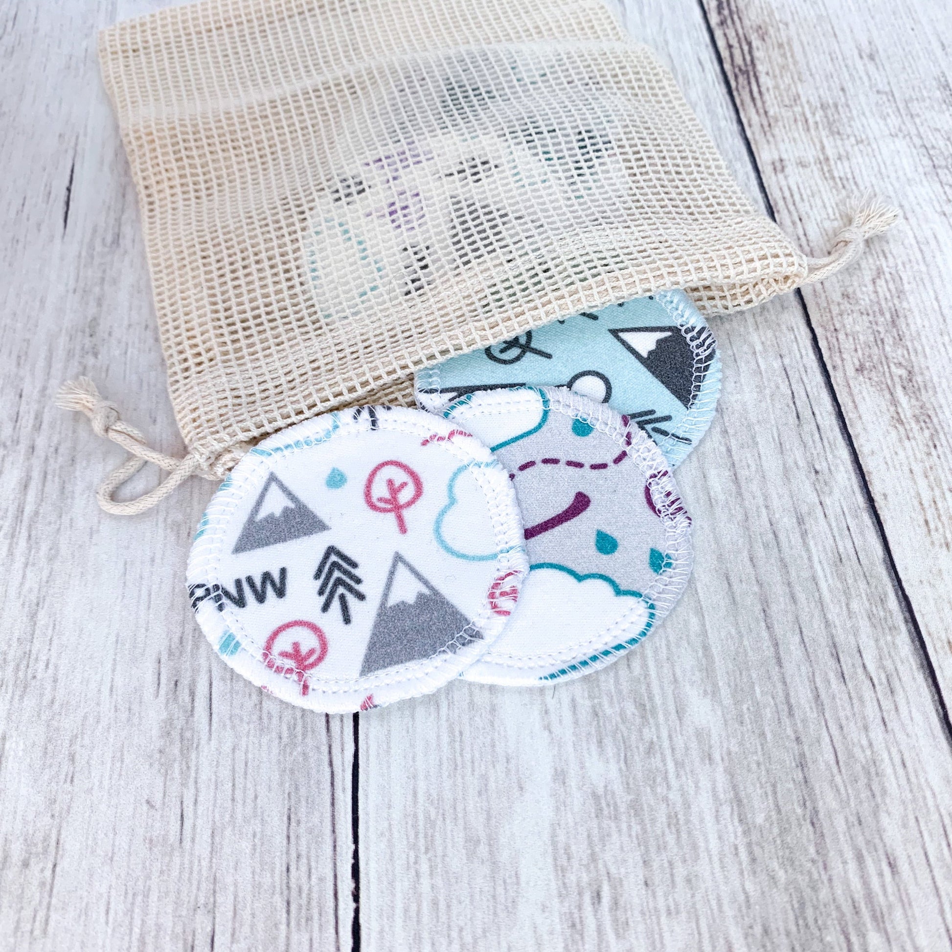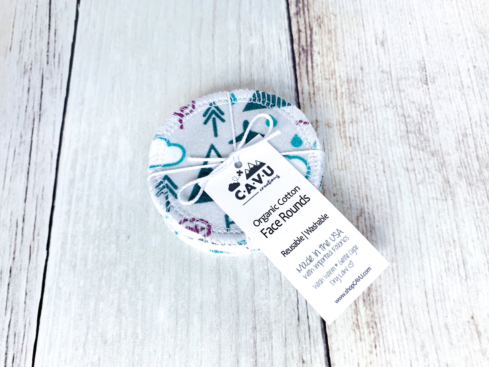 These rounds are handmade with two thick layers of 100% organic cotton fabric, securely joined with an overlocking stitch to give them a clean, finished edge that resists fraying. Each round measures just over 2.5” in diameter. One side has my exclusive prints on interlock fabric in a fun mix of PNW prints in pink, plum, teal, and gray. The reverse is premium white double-brushed flannel.