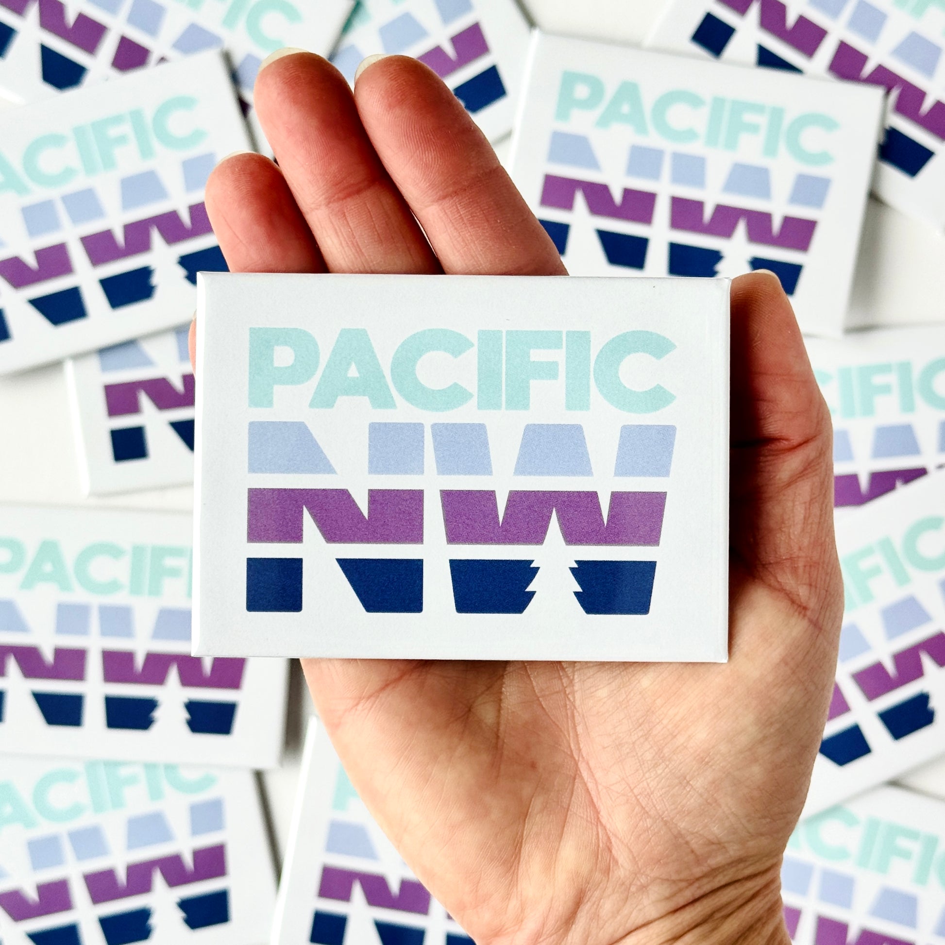 The magnet features a color block "Pacific NW" design with a sweet little evergreen tree in relief. The colors include navy blue, plum, periwinkle, and mint green, all on a crisp white background.