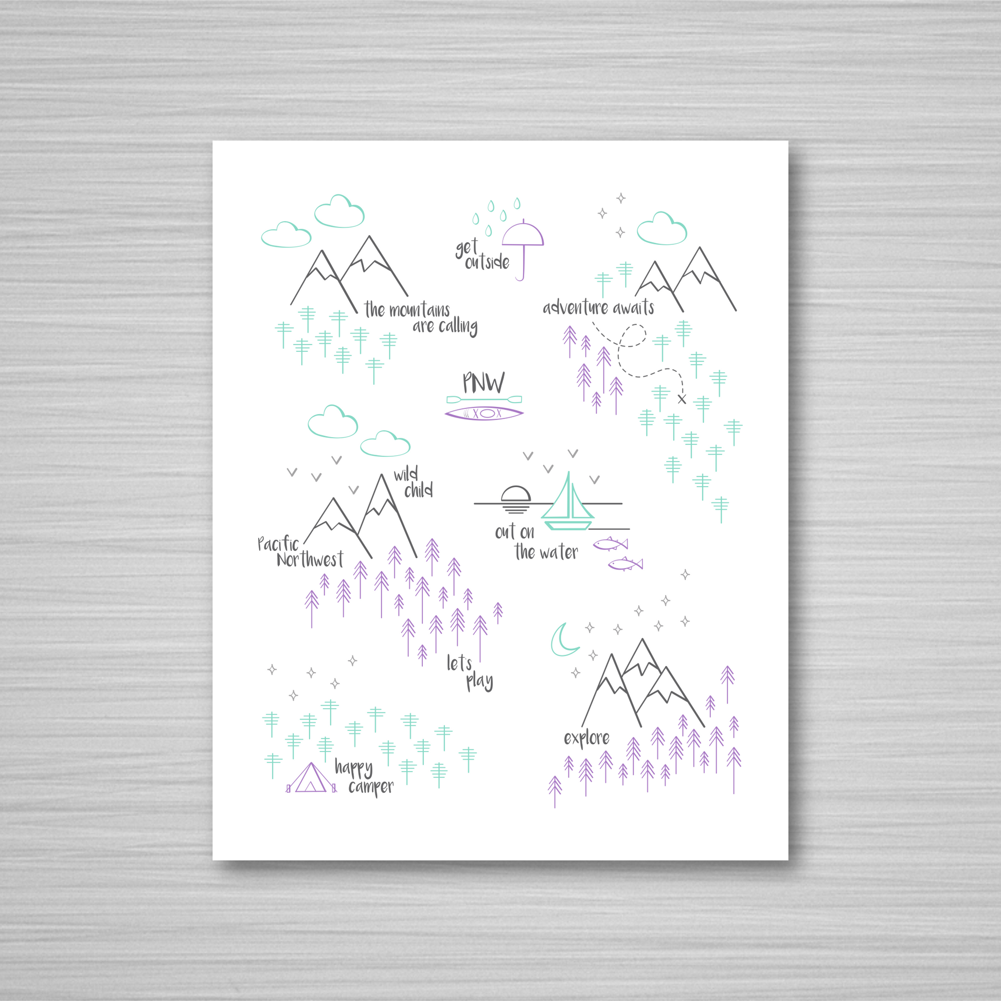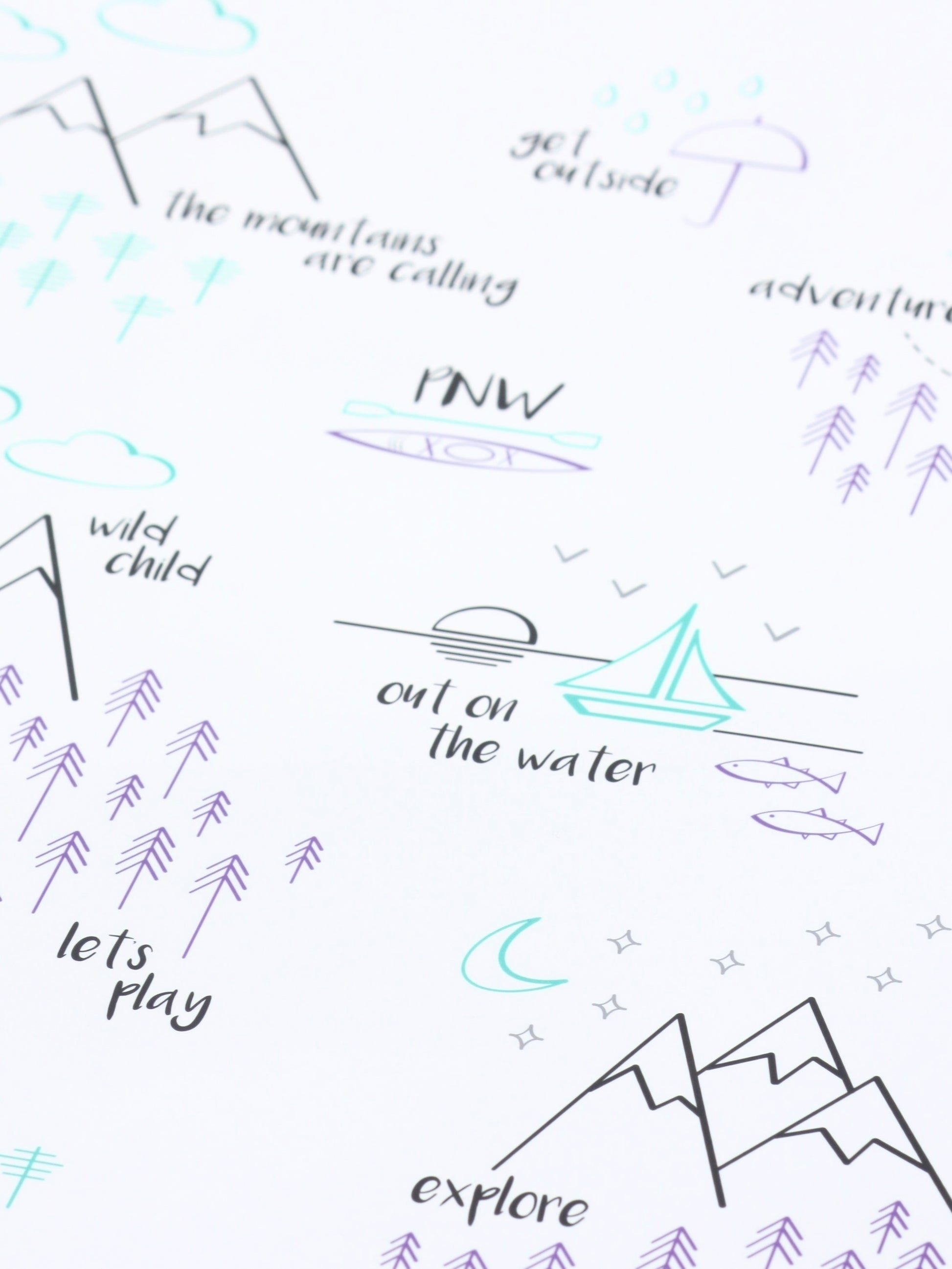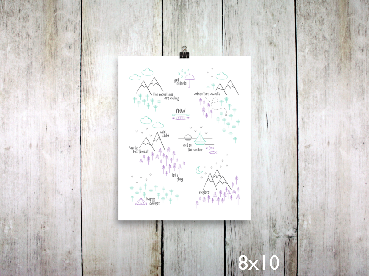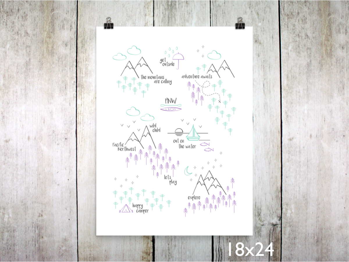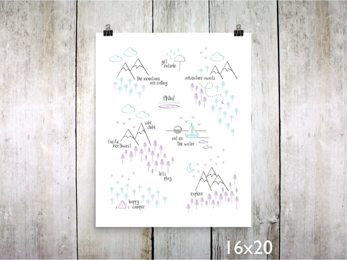 This print depicts all of the wonderful things that make the Pacific Northwest such a special place. The design is full of mountains, trees, trails, and all things PNW. This print is a sweet mix of purple, mint, light gray, and charcoal gray on white. It's an original design that's ready to frame, and the artwork is printed on archival heavyweight paper.