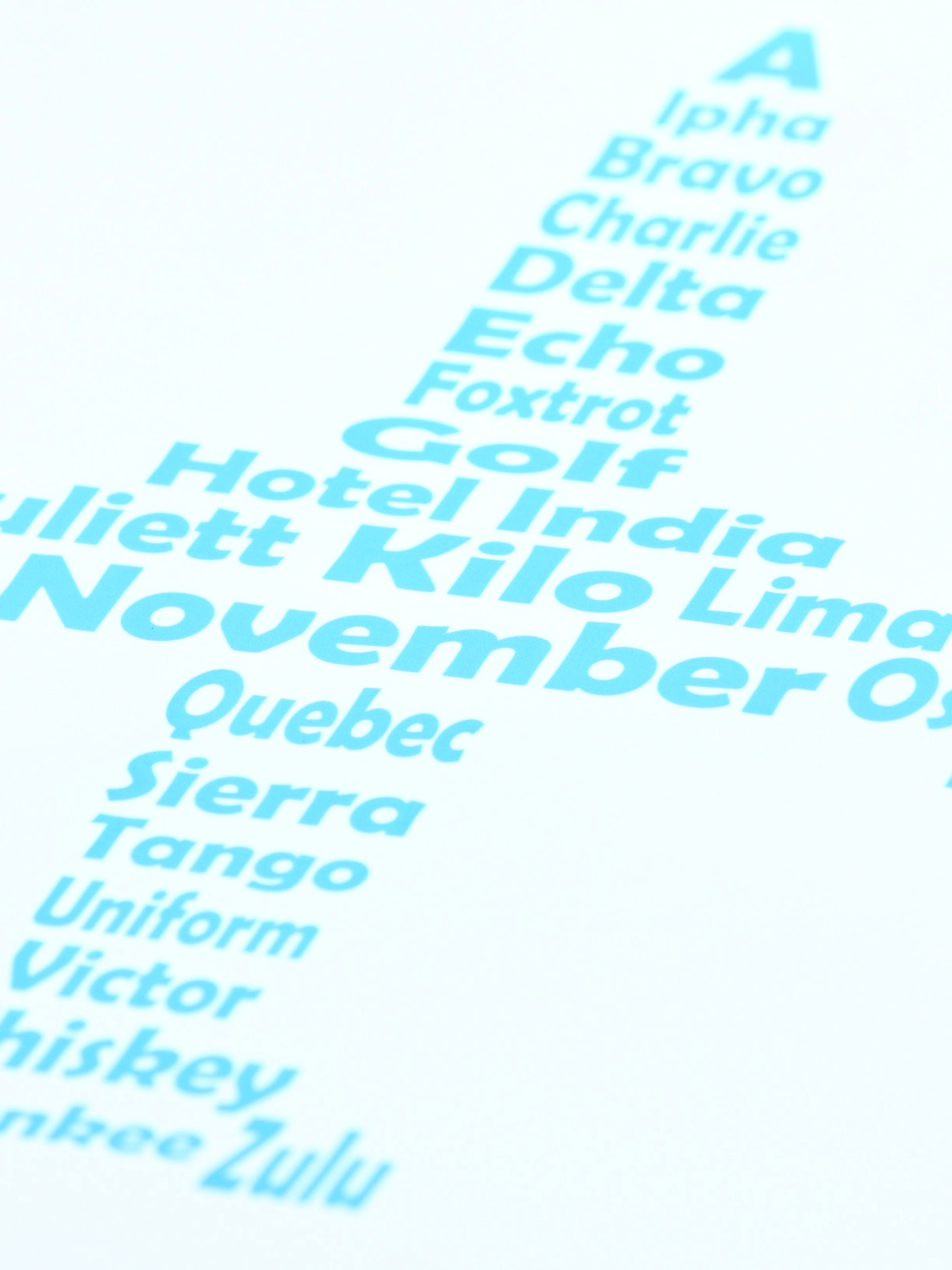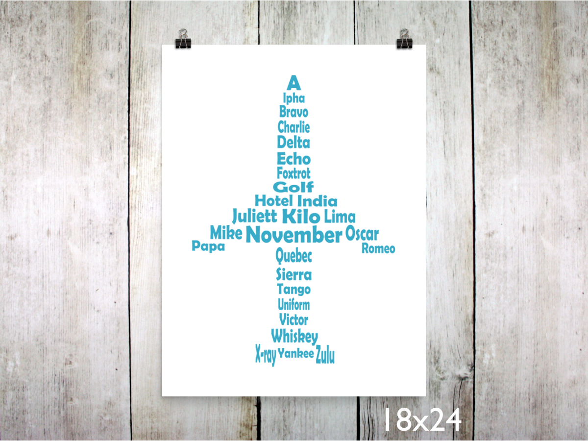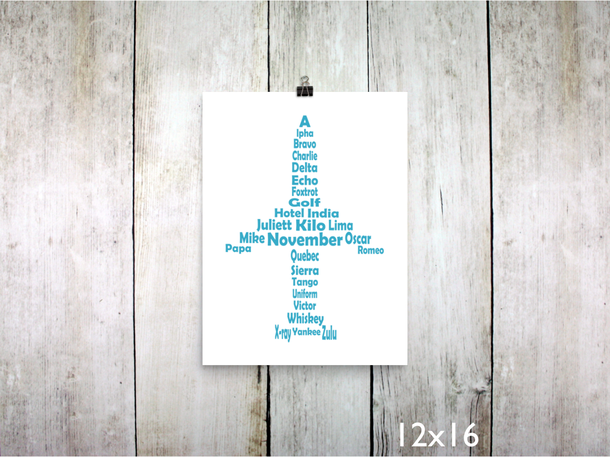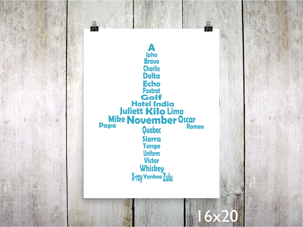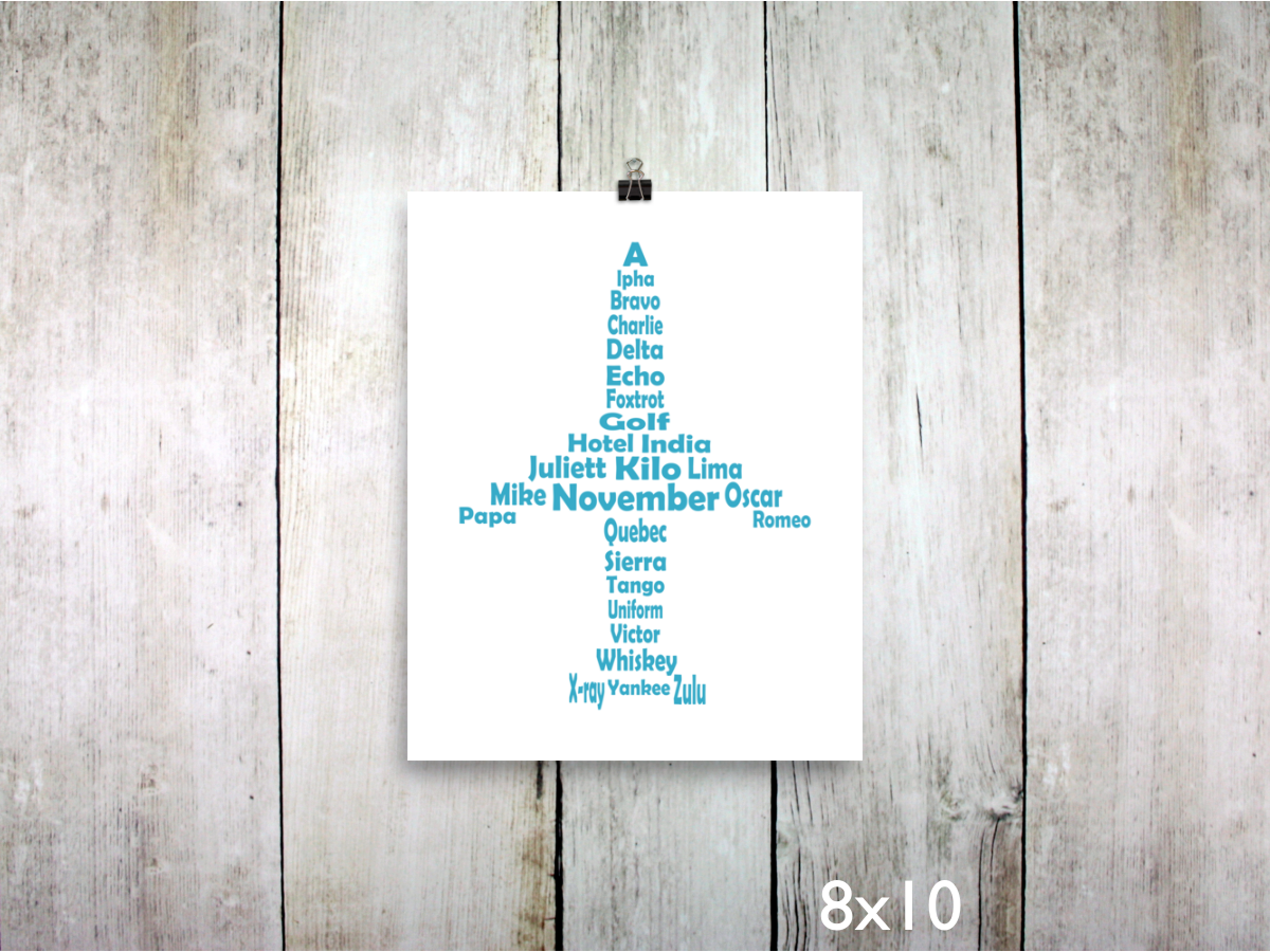 This is an original design I dreamed up with the NATO Phonetic Alphabet laid out in the shape of a jet airplane, in a beautiful sky blue. It's ready to frame, and the artwork is printed on archival heavyweight paper.