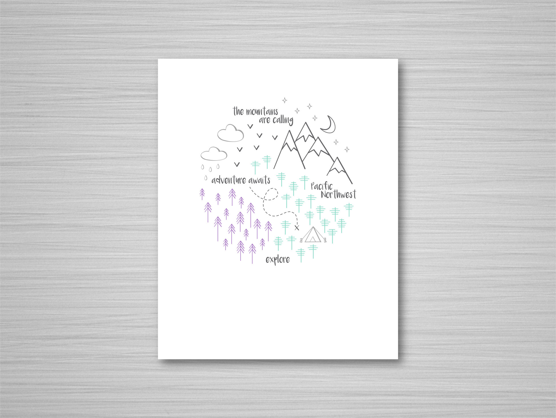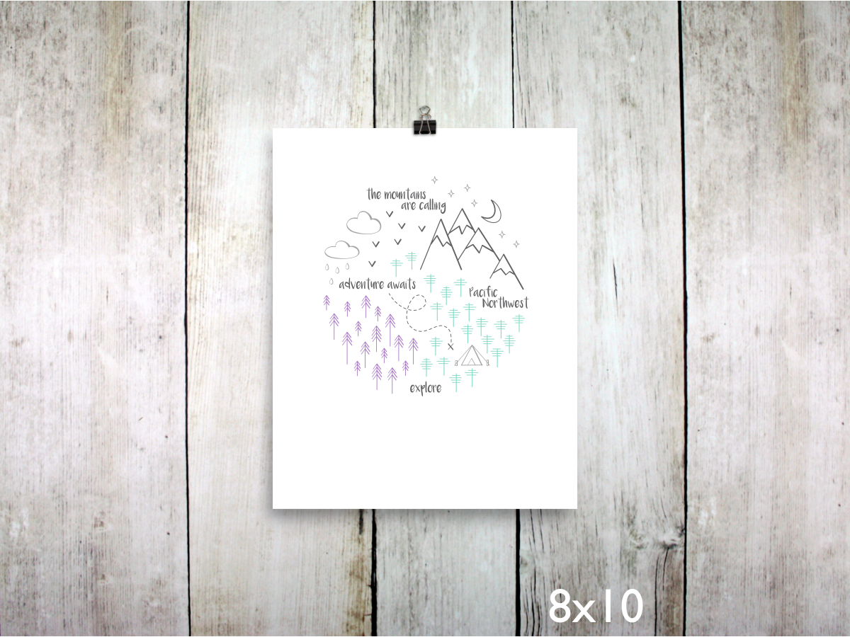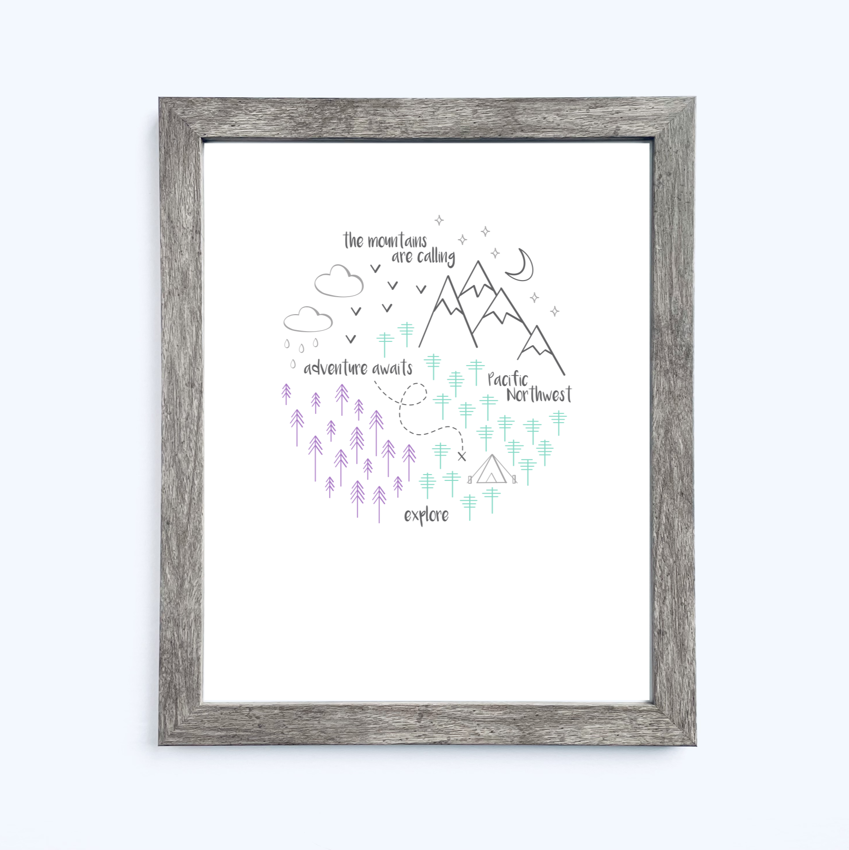 A sweet print full of all the wonderful things that make the Pacific Northwest such a special place, laid out in a circle shape. The design is full of mountains, trees, trails, and all things PNW. This print is an adorable mix of light purple, cool mint, light gray, and charcoal gray on white. It's an original design that's ready to frame, and the artwork is printed on archival heavyweight paper.
