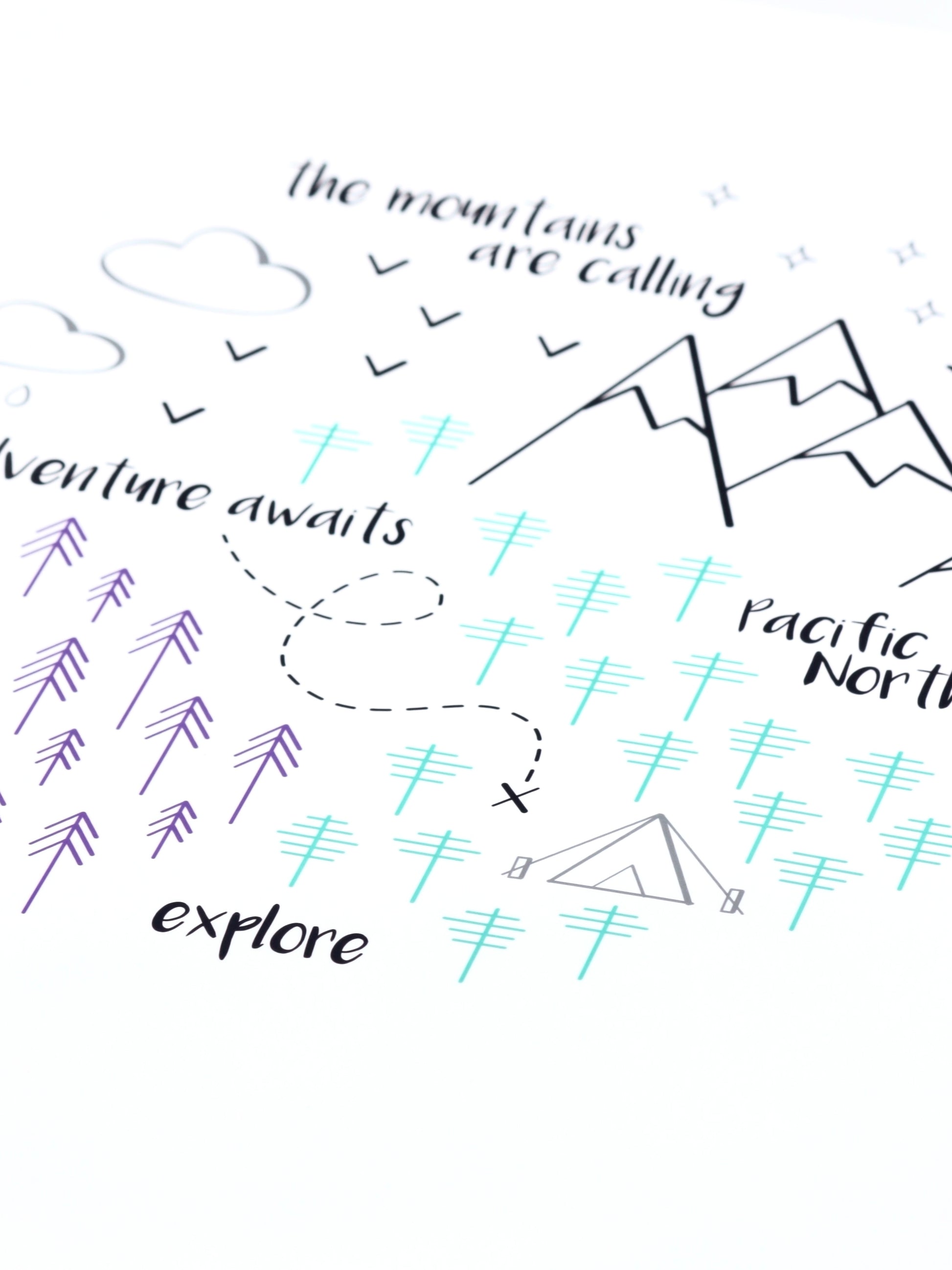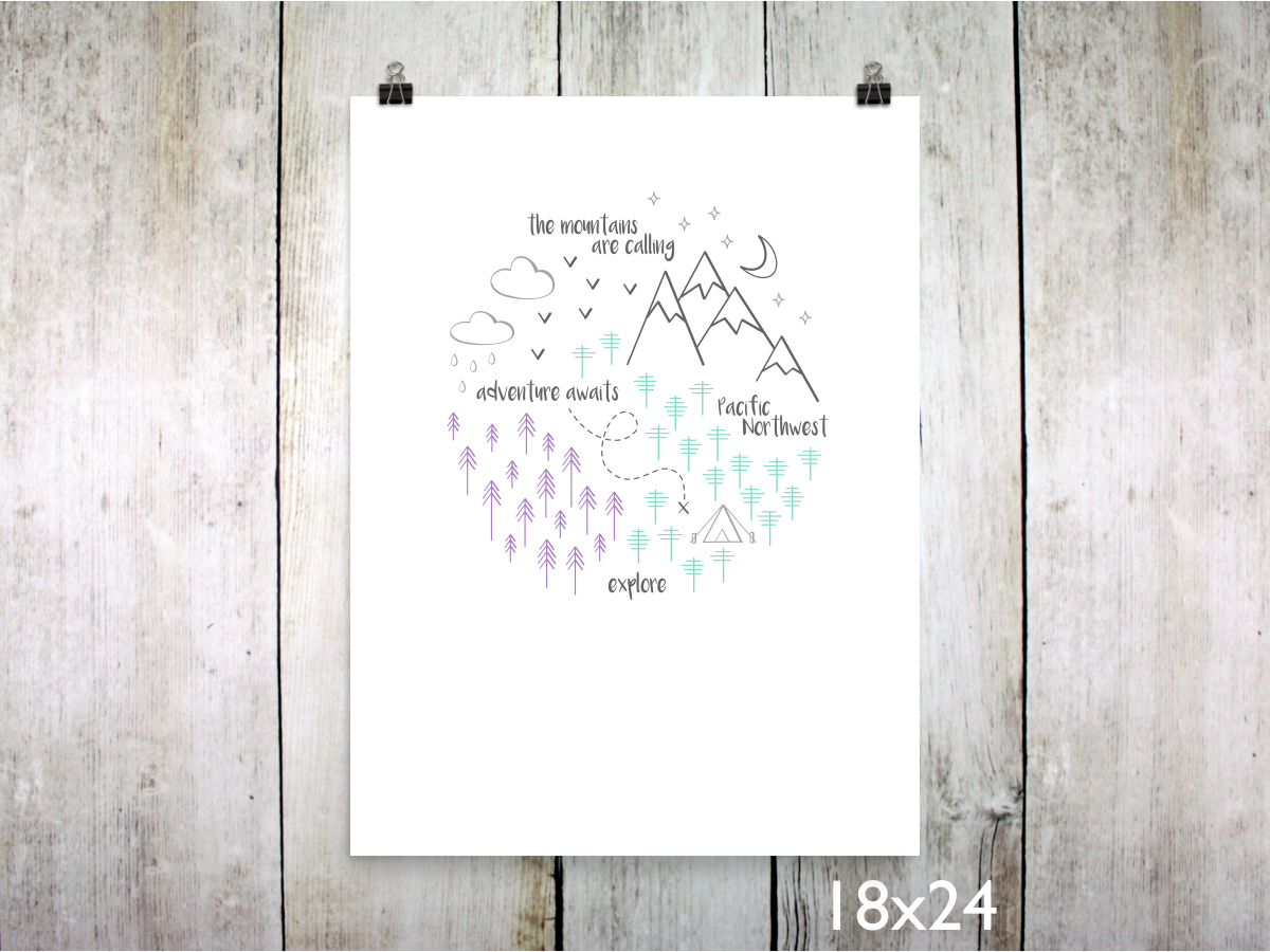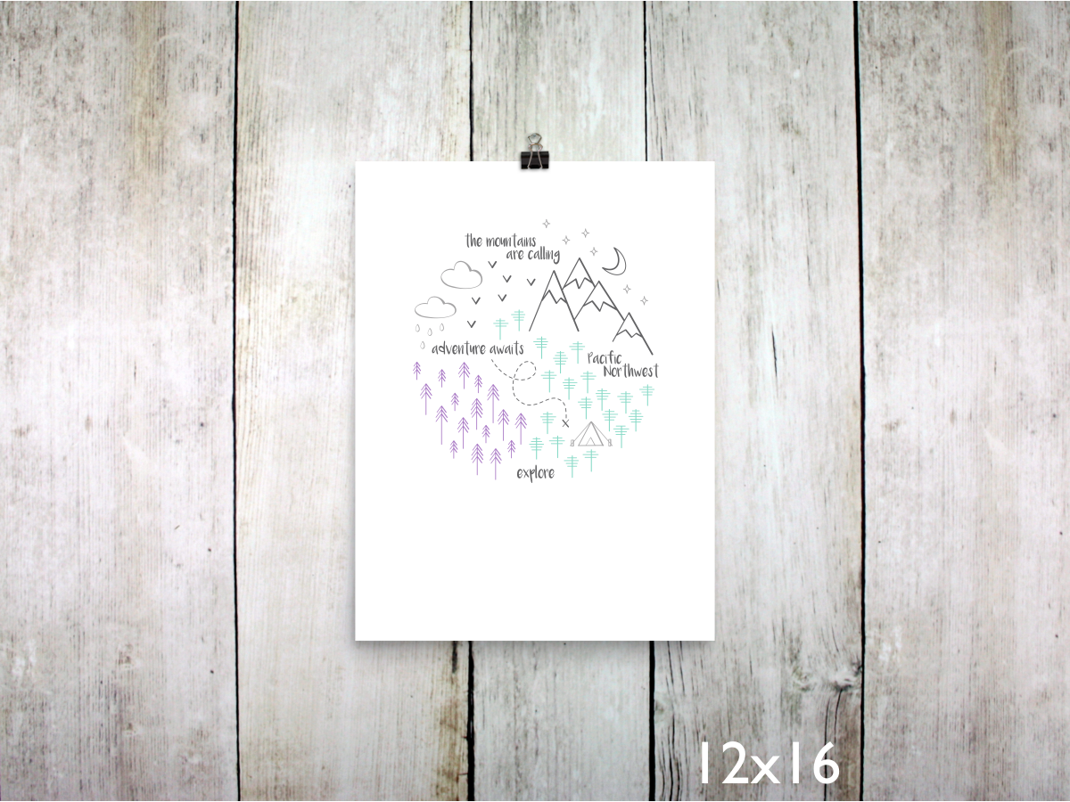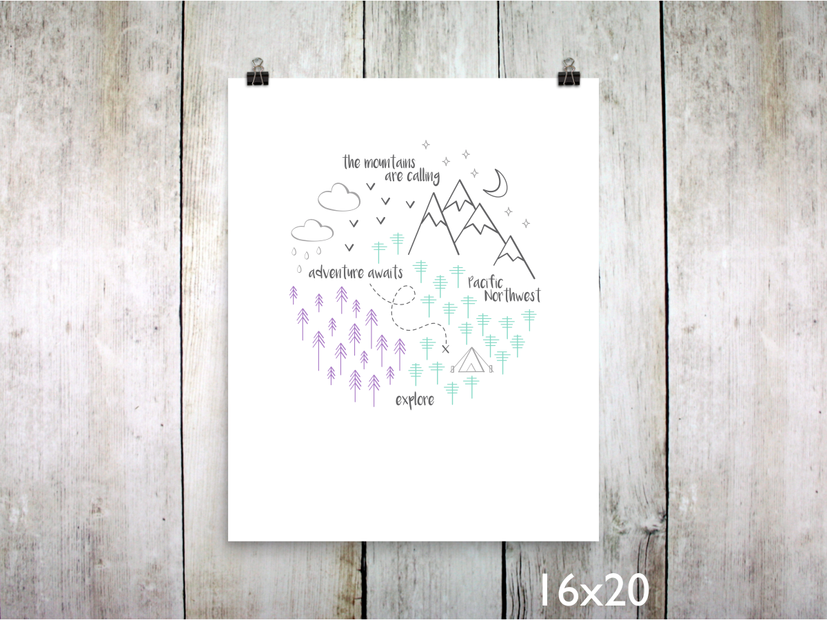 A sweet print full of all the wonderful things that make the Pacific Northwest such a special place, laid out in a circle shape. The design is full of mountains, trees, trails, and all things PNW. This print is an adorable mix of light purple, cool mint, light gray, and charcoal gray on white. It's an original design that's ready to frame, and the artwork is printed on archival heavyweight paper.