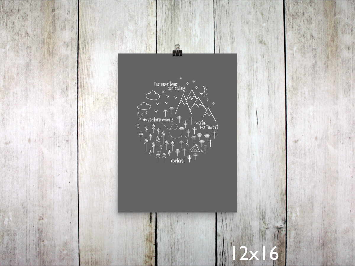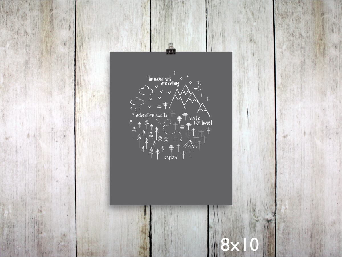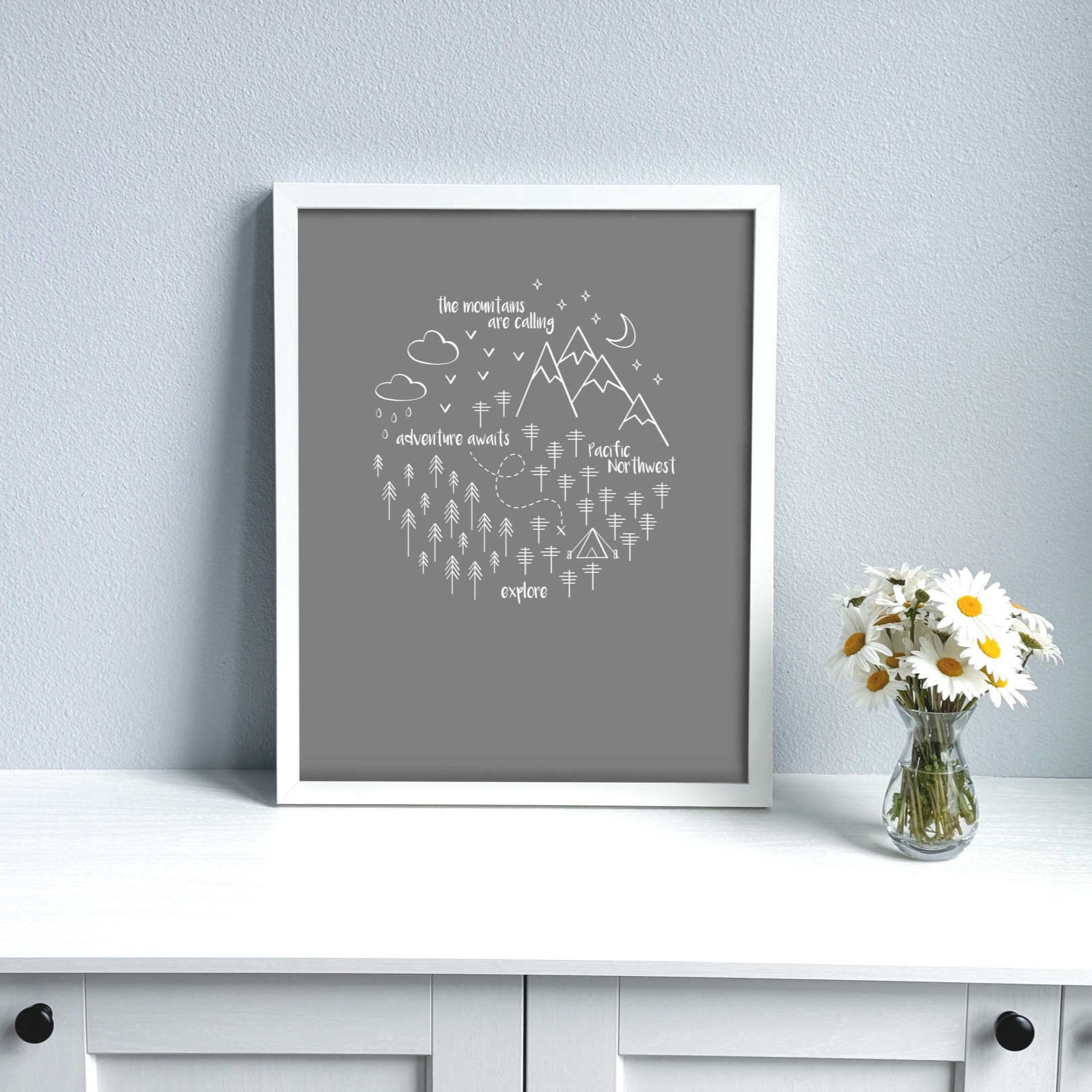A modern and monochrome print full of all the wonderful things that make the Pacific Northwest such a special place, laid out in the shape of a circle. The design is full of mountains, trees, trails, and all things PNW. It's an original design that's ready to frame, and the artwork is printed on archival heavyweight paper.
