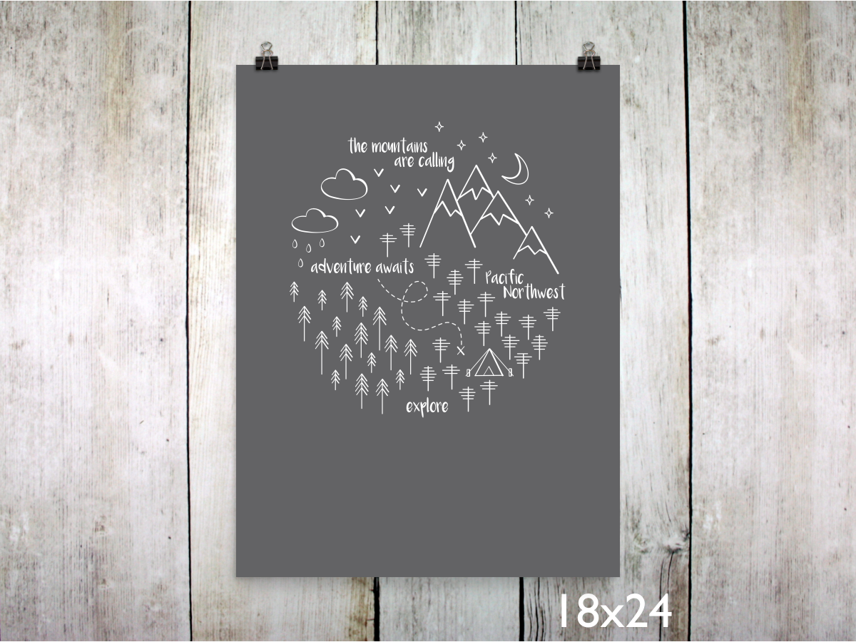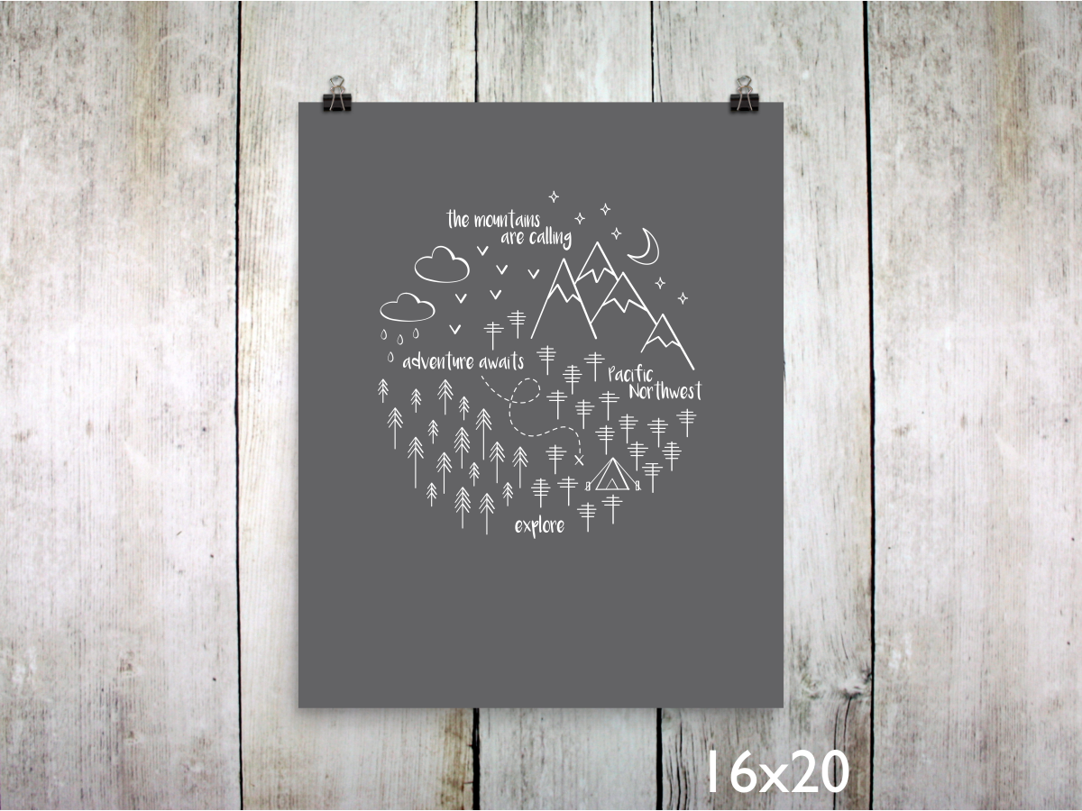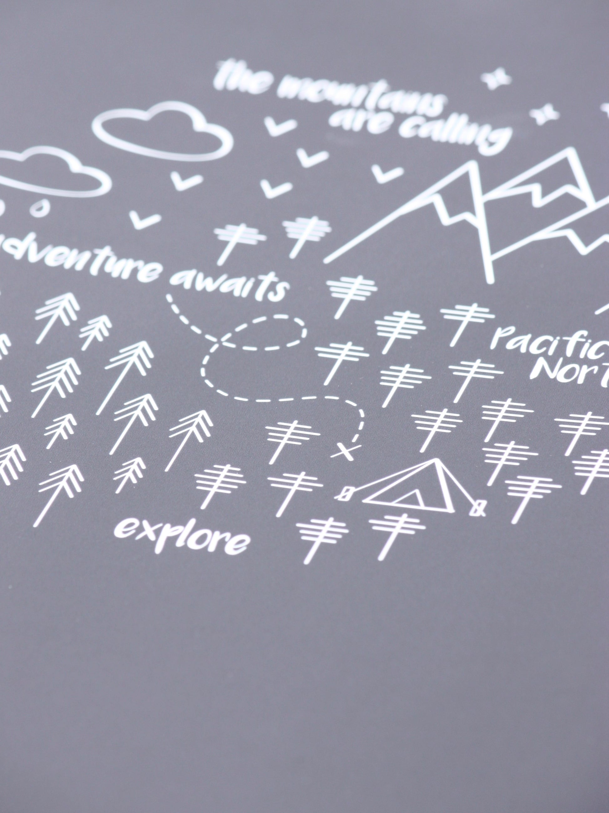 A modern and monochrome print full of all the wonderful things that make the Pacific Northwest such a special place, laid out in the shape of a circle. The design is full of mountains, trees, trails, and all things PNW. It's an original design that's ready to frame, and the artwork is printed on archival heavyweight paper.