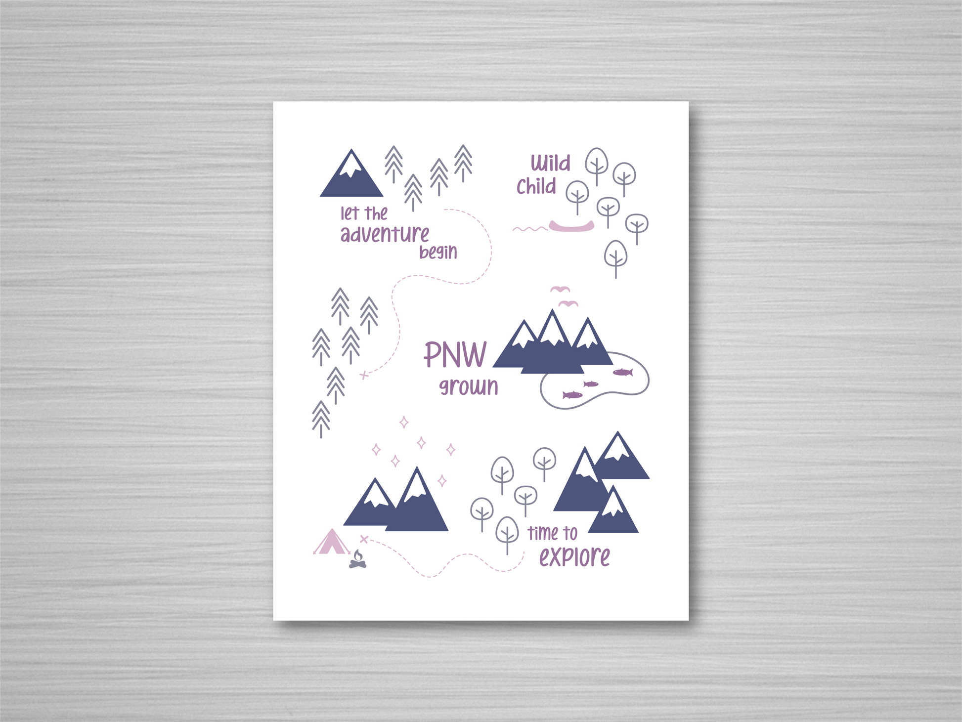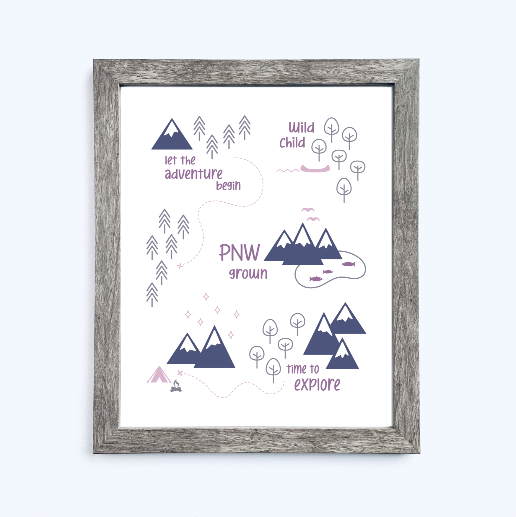 This navy, plum, pink, and gray design is full of mountains, trees, trails, and all things PNW. The print depicts all of the wonderful things that make the Pacific Northwest such an amazing place to live and play. This colors in this print are plum, pink, navy blue, and gray. It's an original design that's ready to frame, and the artwork is printed on archival heavyweight paper.
