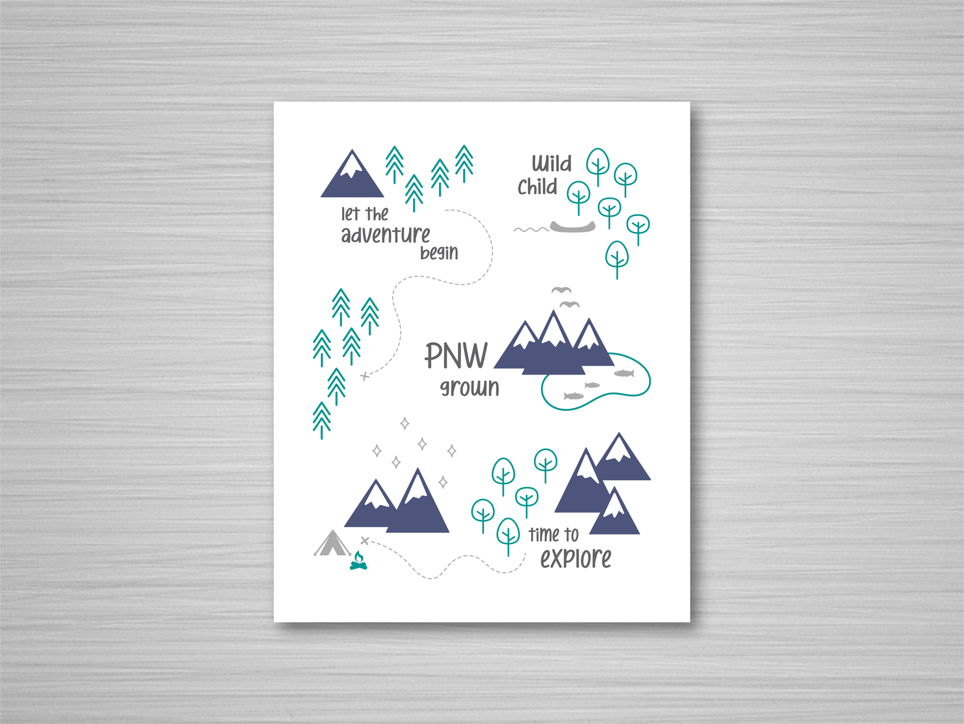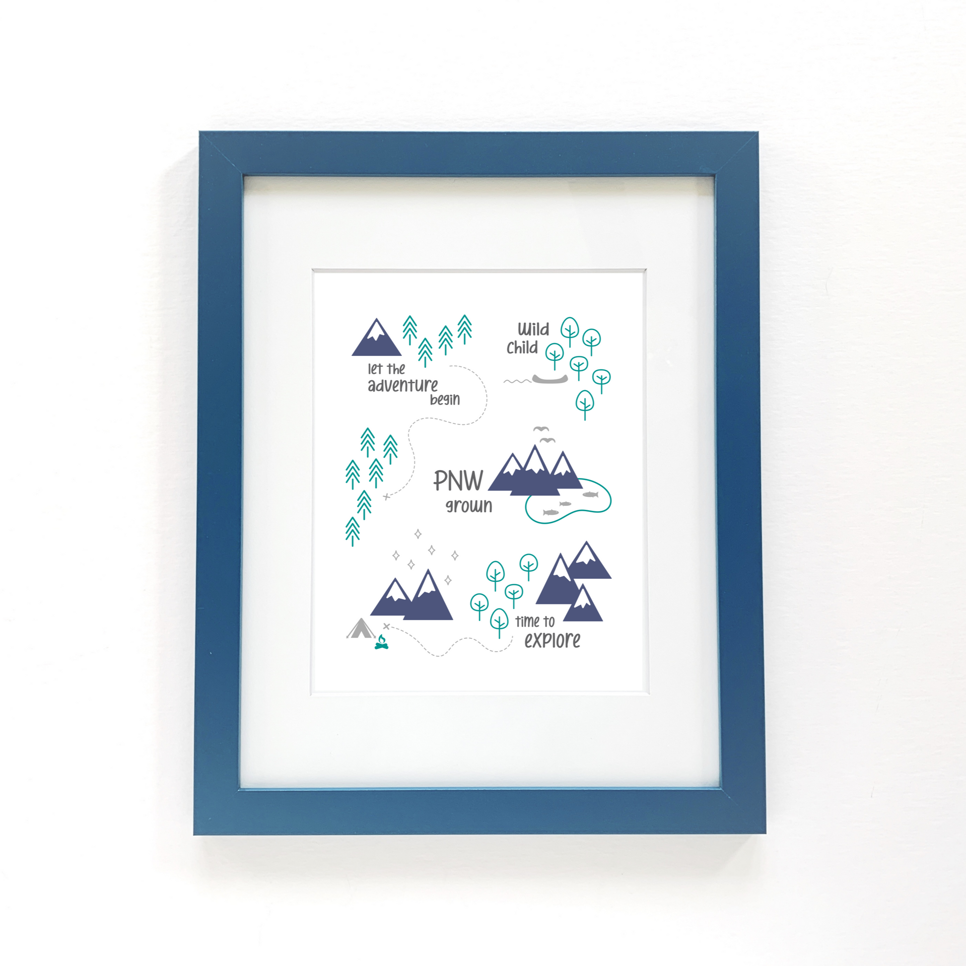 This is an original design full of mountains, trees, trails, and all things PNW. The print depicts all of the wonderful things that make the Pacific Northwest an amazingly fun place. The colors in this artwork include emerald green, navy blue, and gray. This print is ready to frame, and the artwork is printed on archival heavyweight paper.
