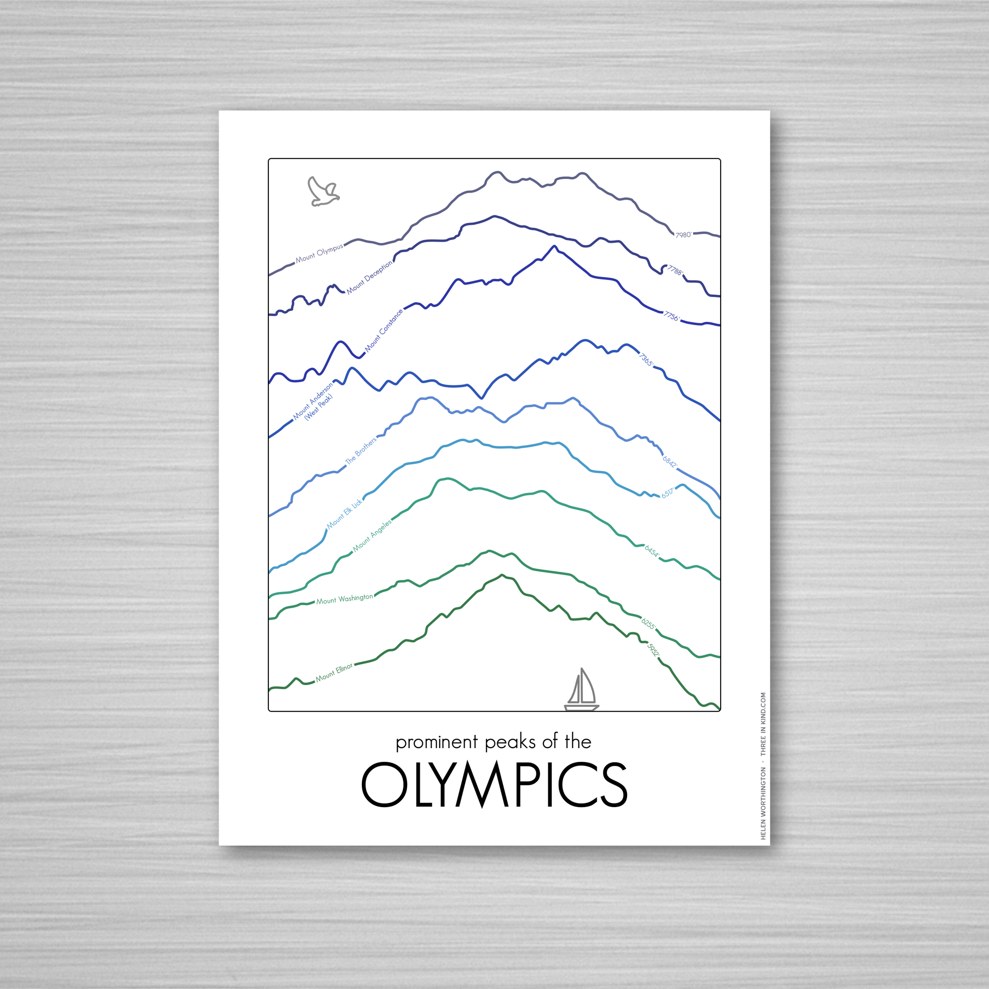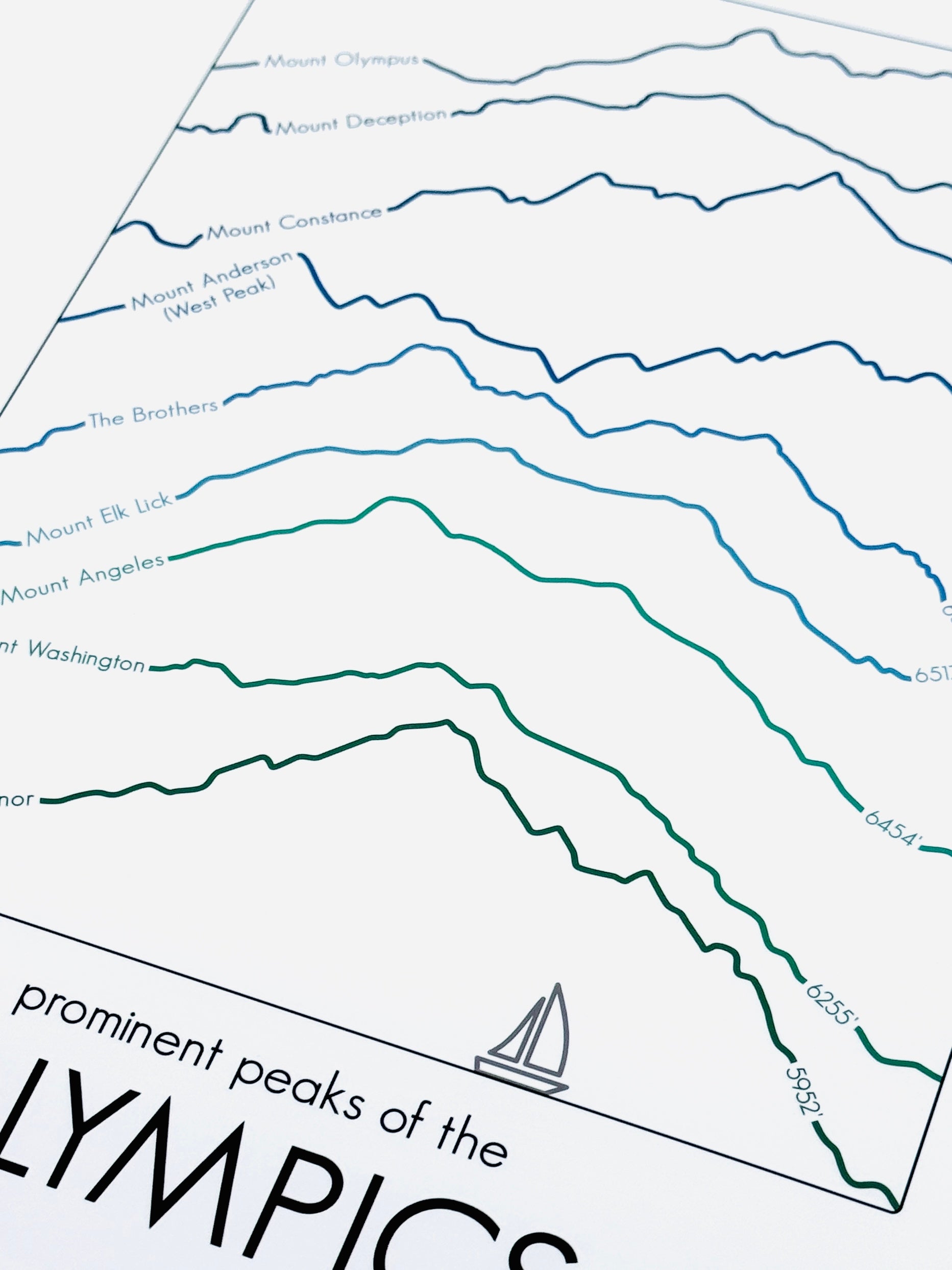 The Olympics provide some of the most stunning vistas from Seattle and up and down the Puget Sound. In this design you'll find nine of the most prominent peaks in elevation order, along with a fun splash of color. The exact numbers are sometimes debated, but as with all my prints in the Summit Series, I chose to use the official USGS elevations whenever possible.