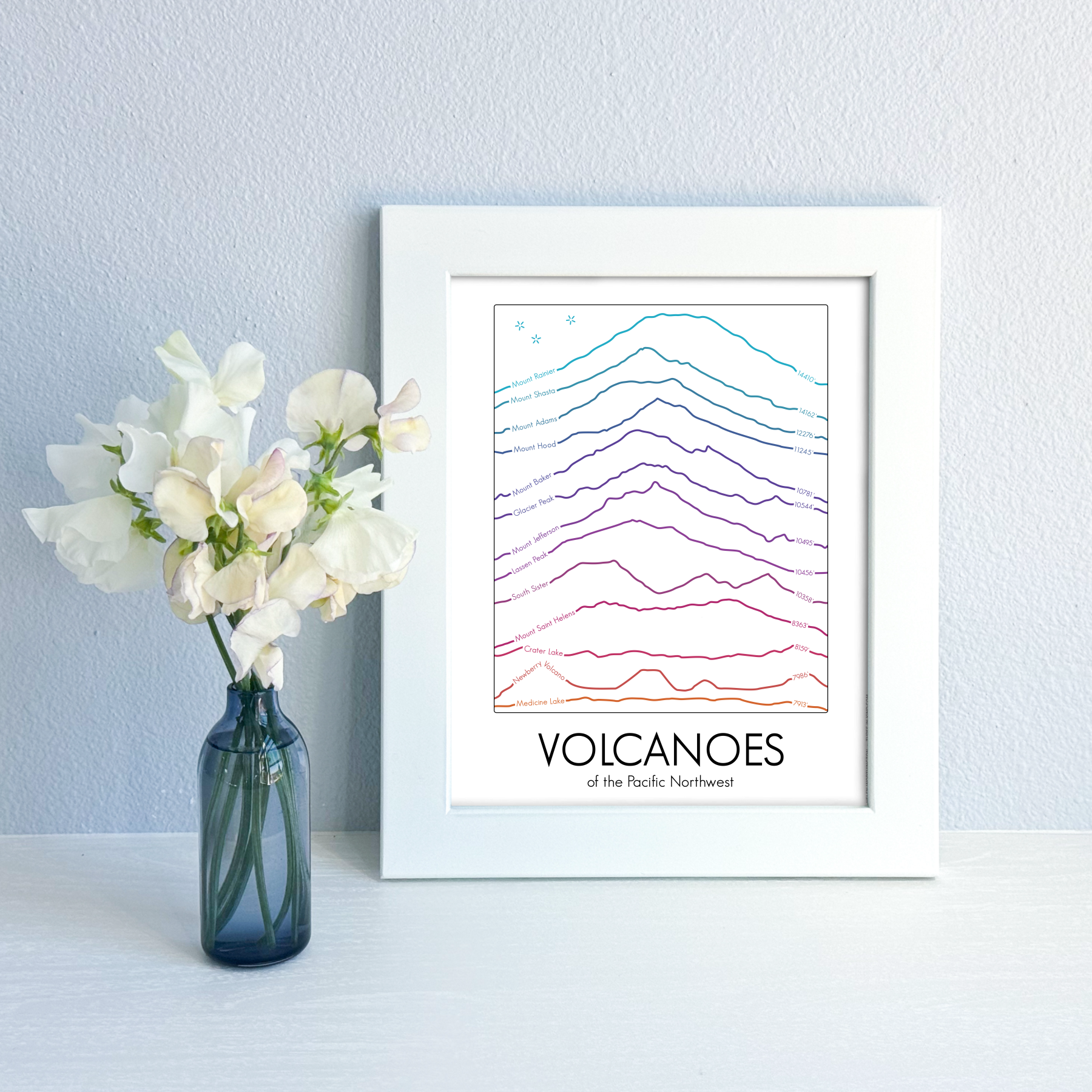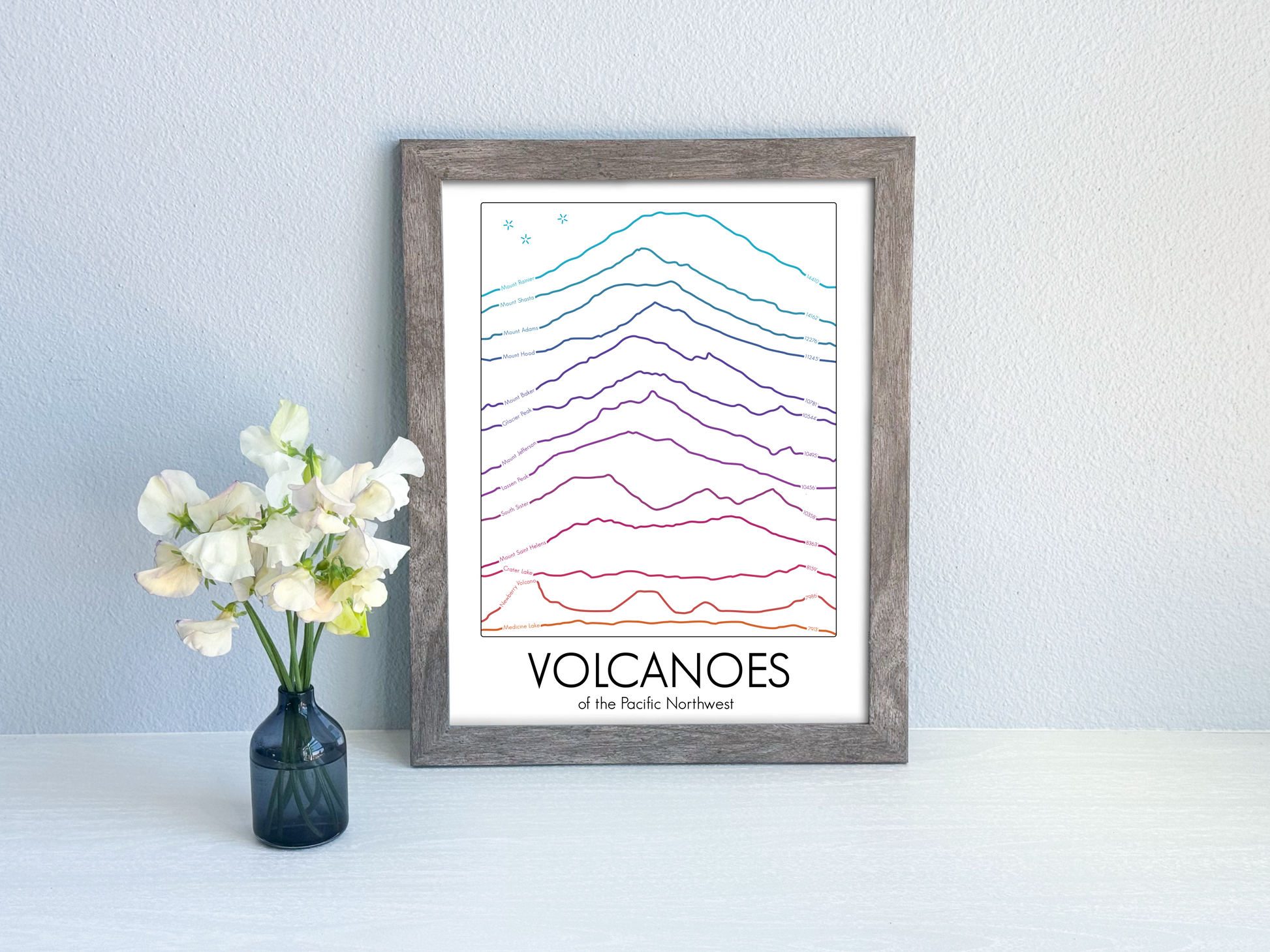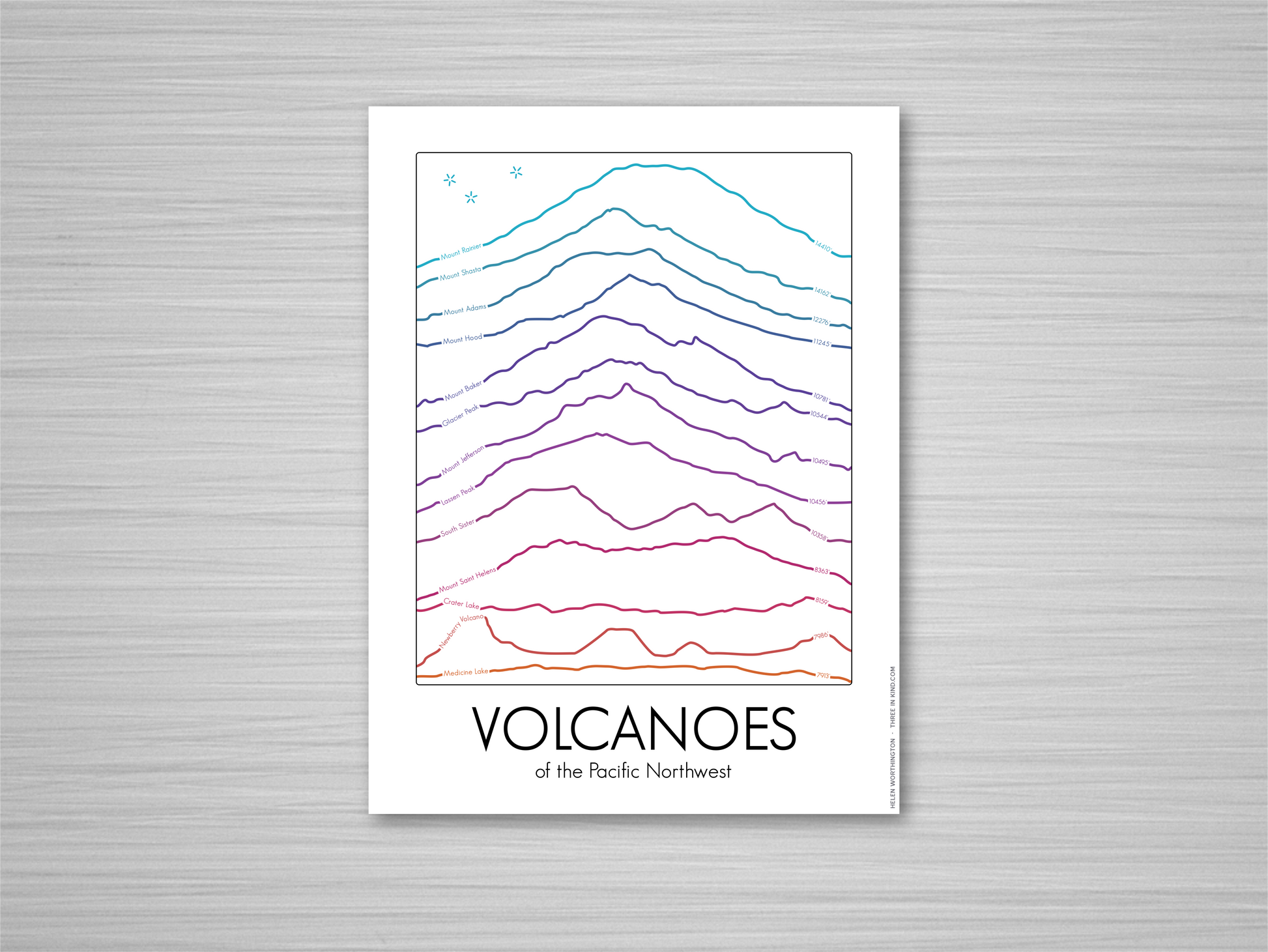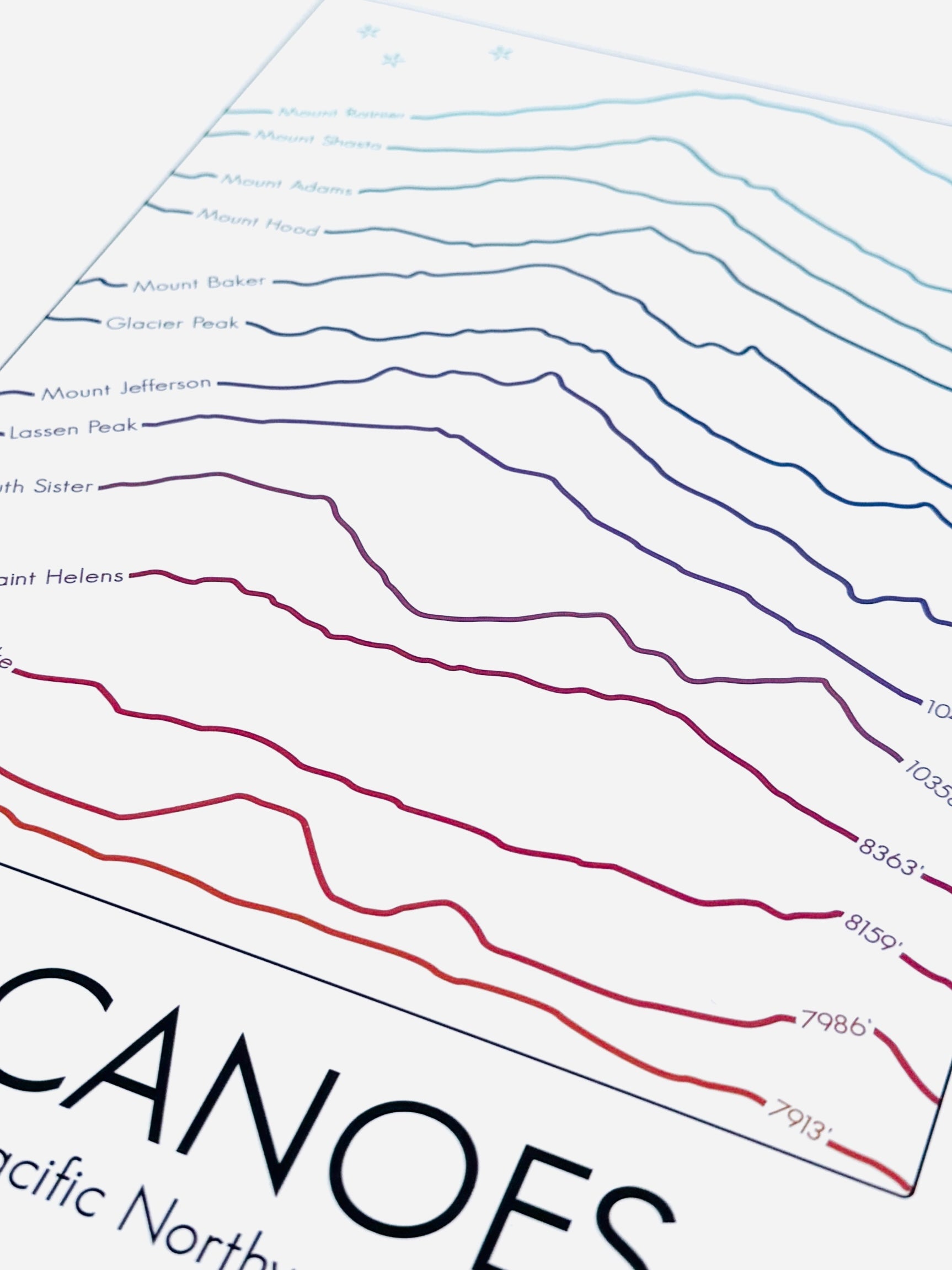 Did you know we have 13 active volcanoes in the Pacific Northwest region of the United States? In this design I've stacked all of them, in height order, and incorporated their names and elevations along their profile lines. The exact numbers are sometimes debated, but as with all my prints in the Summit Series, I used the official USGS elevations whenever available.