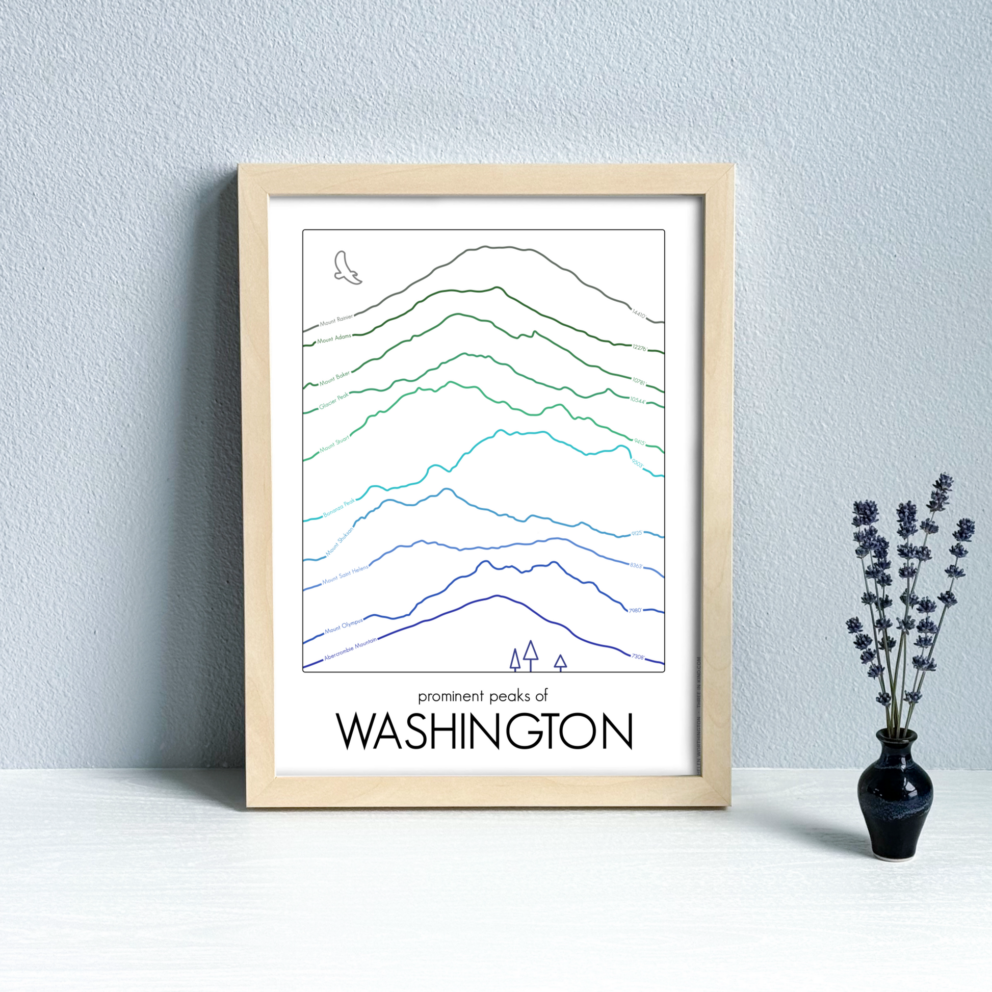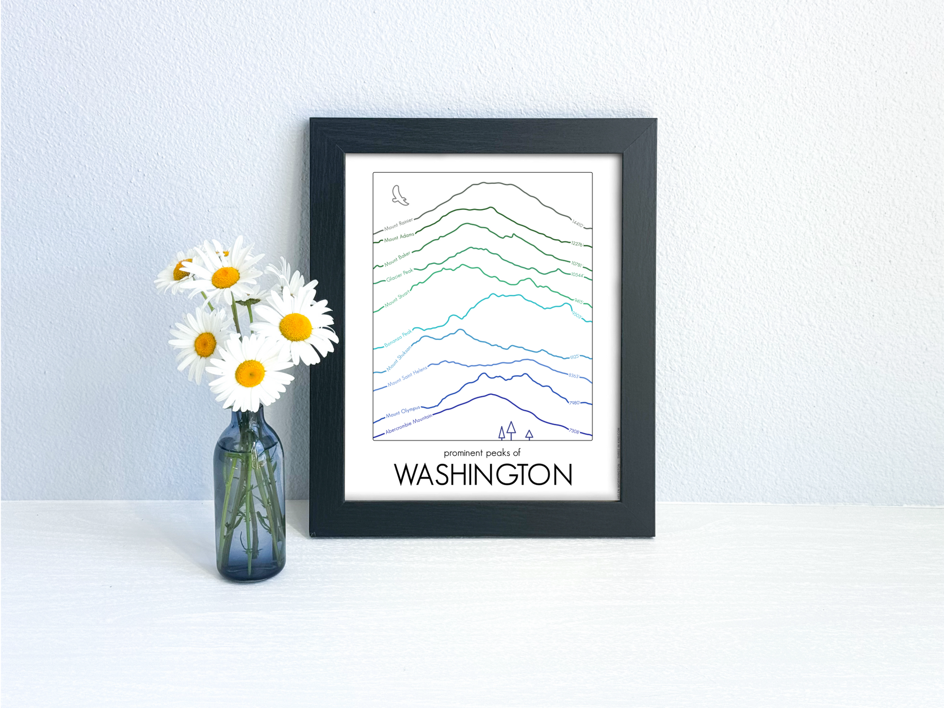 Washington State is home to some of the most iconic peaks in North America. Find the ten most prominent ones in this new design I've created. I've stacked all of them, in height order, and incorporated their names and elevations along their profile lines. The exact numbers are sometimes debated, but as with all my prints in the Summit Series, I used the official USGS elevations whenever available.