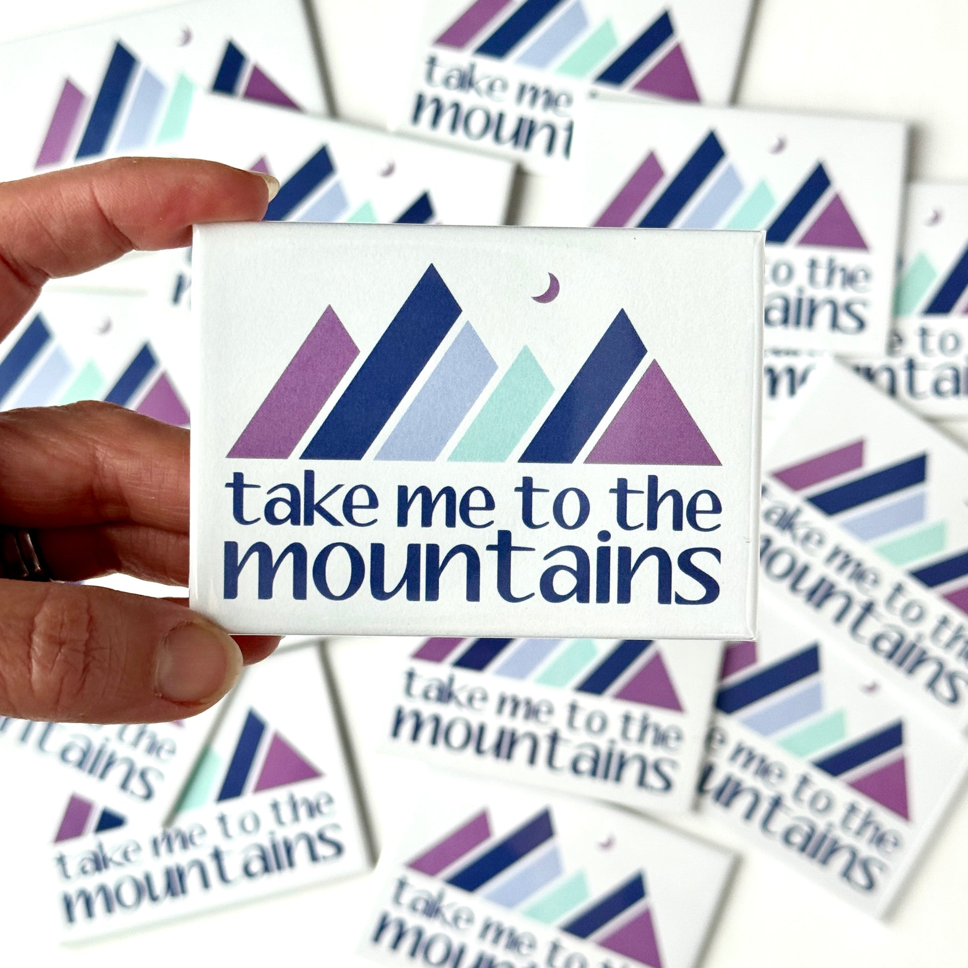 The magnet features a color block mountain range with a sweet little crescent moon, and the words "take me to the mountains" underneath. The colors include navy blue, plum, periwinkle, and mint, all on a crisp white background.