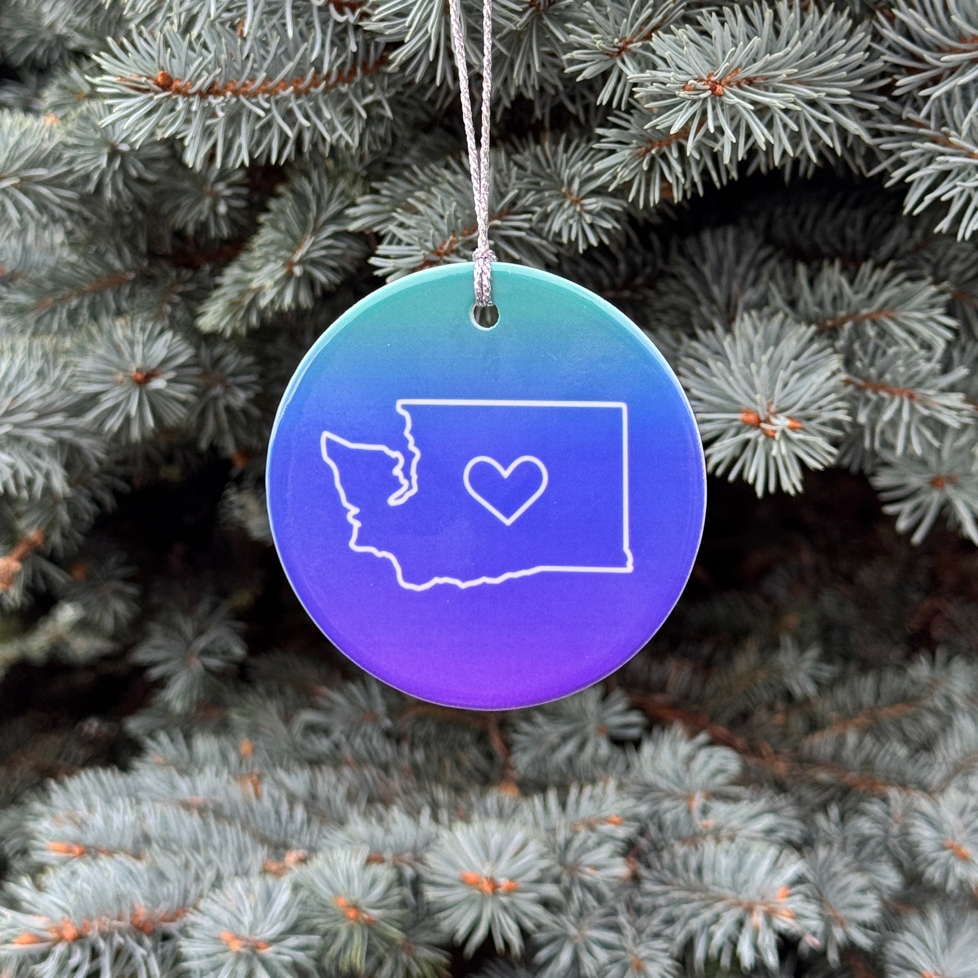Show off your love for Washington State! This ornament features a heart set inside an outline of Washington, all atop a rich color gradient ranging from purple to blue to teal.