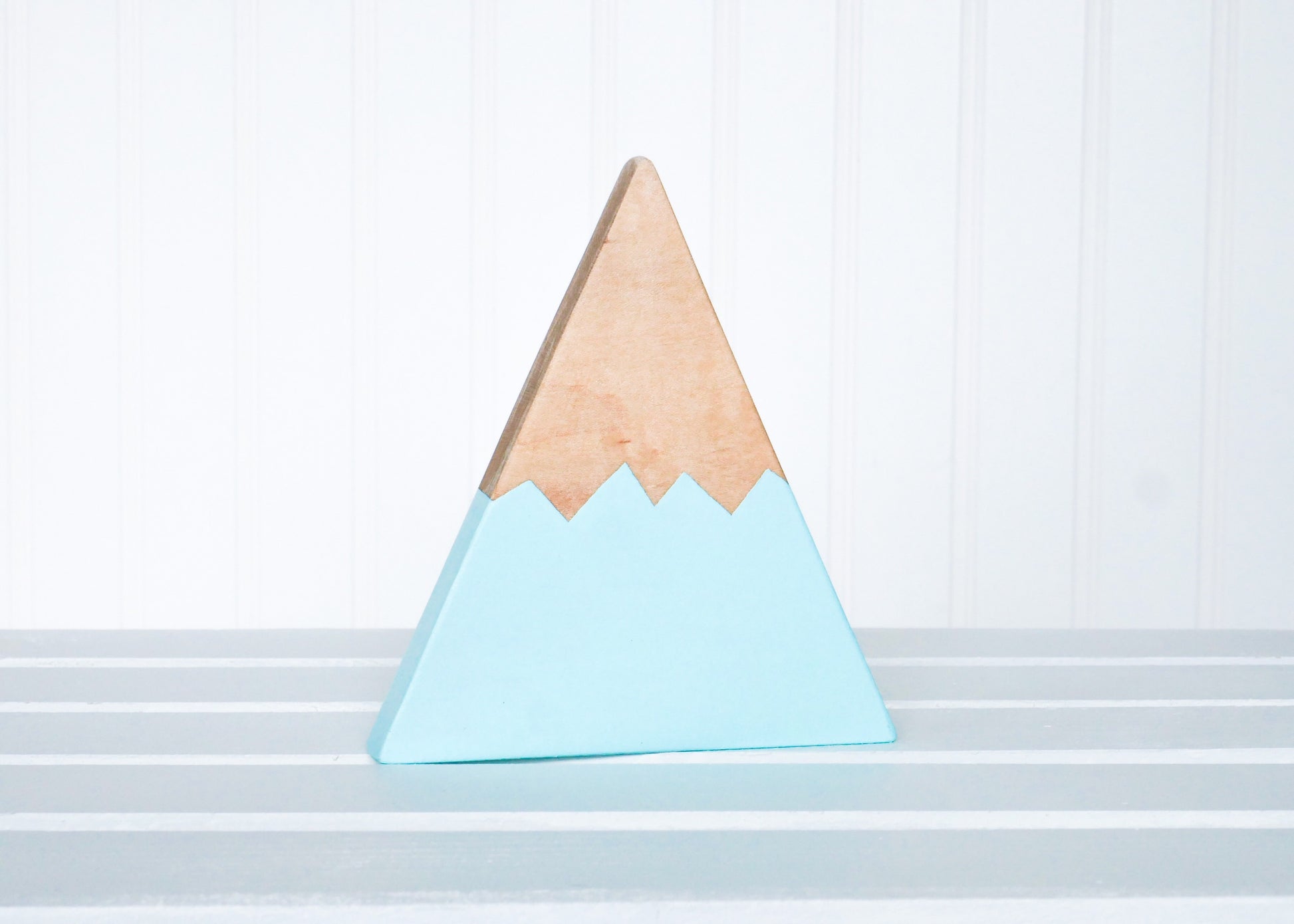 The mountains are handcrafted from solid maple and painted a sweet mint green on the bottom with the "snow" in the natural light wood color. They're individually cut from solid 3/4" thick maple, hand-sanded for a smooth finish, hand-painted, and then sealed with a clear coat. The mountains are finished on both sides and stand on their own.
