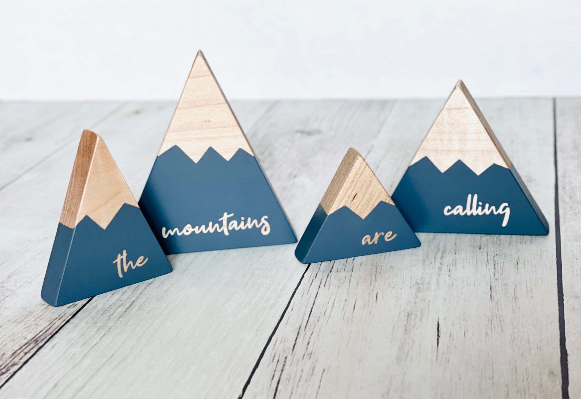 This is a smaller version of my larger “the mountains are calling” set, with the tallest mountain measuring 4.5” high. These four handcrafted wooden mountains stand on their own and make a sweet decor piece for the mantle, bookcase, in the nursery, or pretty much anywhere you set them.
